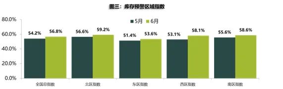 从区域指数情况看:调查显示,6月份全国总指数为56.8%,北区指数为59.2%,东区指数为53.6%,西区指数为58.1%,南区指数为58.6%。北方地区疫情反复,促销费政策及车展活动等难以展开,库存压力延续。