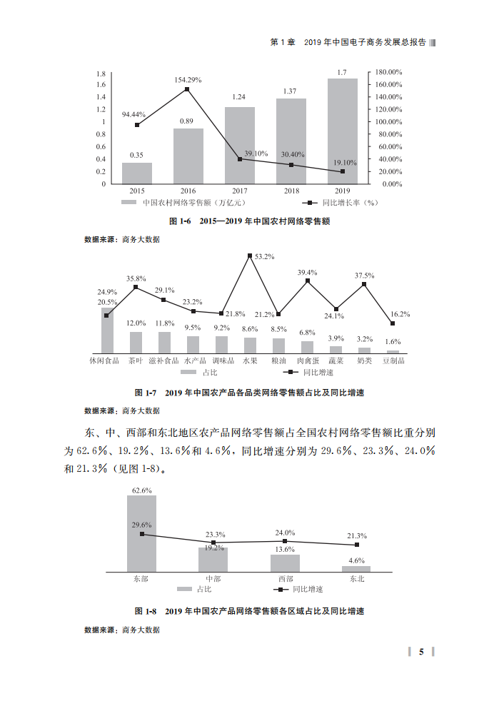 结构效益更加优化。2019年,农村电商进入规模化专业化发展阶段,跨境电商成为外贸转型升级的重要方向。全国农村网络零售额达1.7万亿元,同比增长19.1%;农产品网络零售额3975亿元,同比增长27%。截至2019年,电子商务进农村综合示范对全国832个国家级贫困县实现全覆盖,电商扶贫对接、“三品一标”认证深入实施,工业品下行、农产品上行的双向渠道进一步畅通,“下沉市场”的消费潜力得到释放。通过海关跨境电子商务管理平台零售进出口商品总额达1862.1亿元,同比增长38.3%。新增24个跨境电商综合试验区,截至2019年年底,试验区总数达到59个,成熟的经验做法加快向全国复制推广,跨境电商政策体系不断完善。