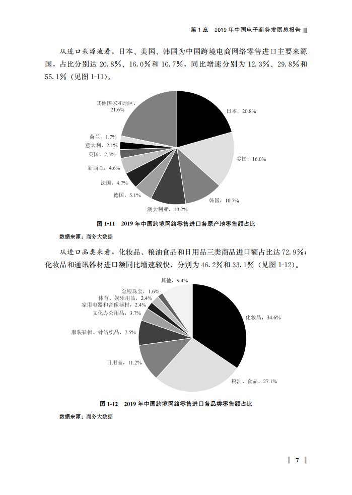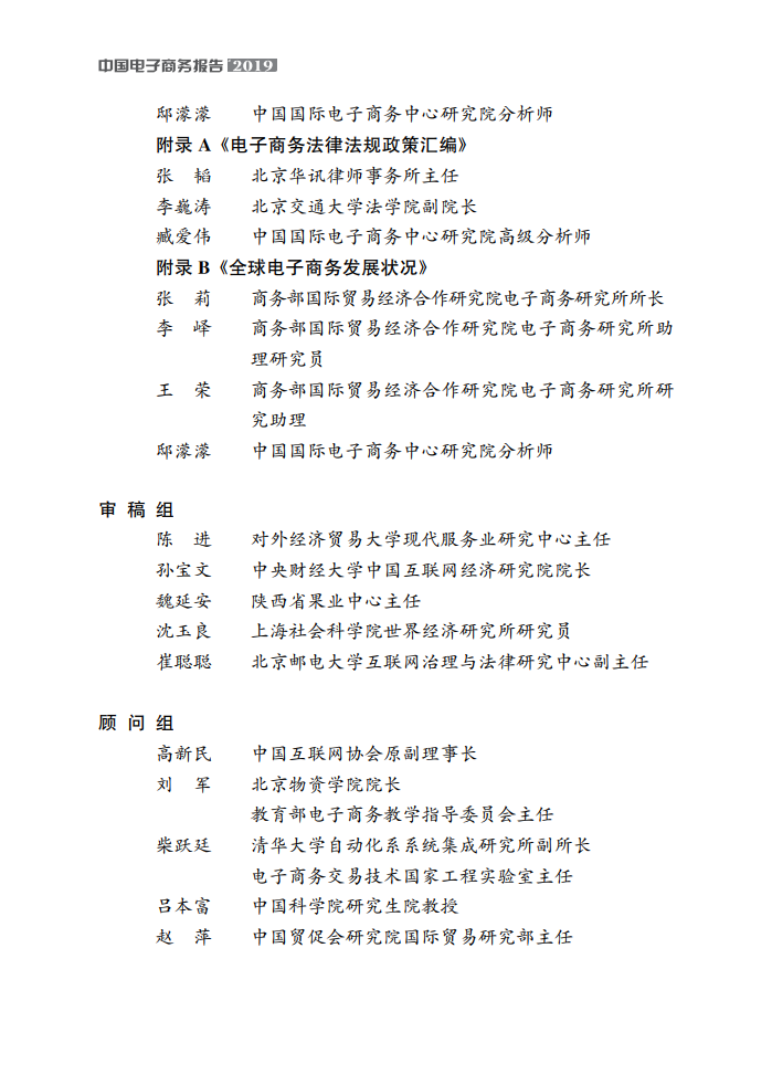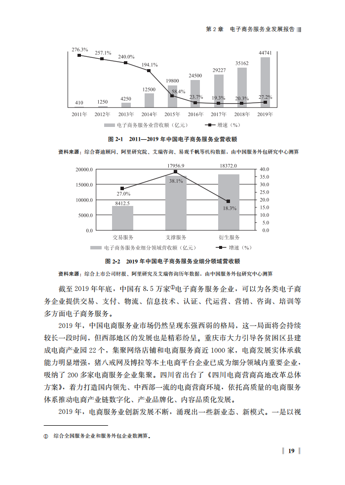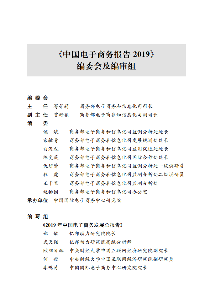 商务部电子商务司发布了《中国电子商务报告2019》(E-Commerce in China 2019)。报告对2019年中国电子商务发展情况、发展特点以及未来发展趋势进行了总结盘点。报告显示,2019年,中国电子商务市场规模持续引领全球,服务能力和应用水平进一步提高。中国网民规模已超过9亿人,互联网普及率达64.5%;全国电子商务交易额达34.81万亿元,其中网上零售额10.63万亿元,同比增长16.5%,实物商品网上零售额8.52万亿元,占社会消费品零售总额的比重上升到20.7%;电子商务从业人员达5125.65万人。