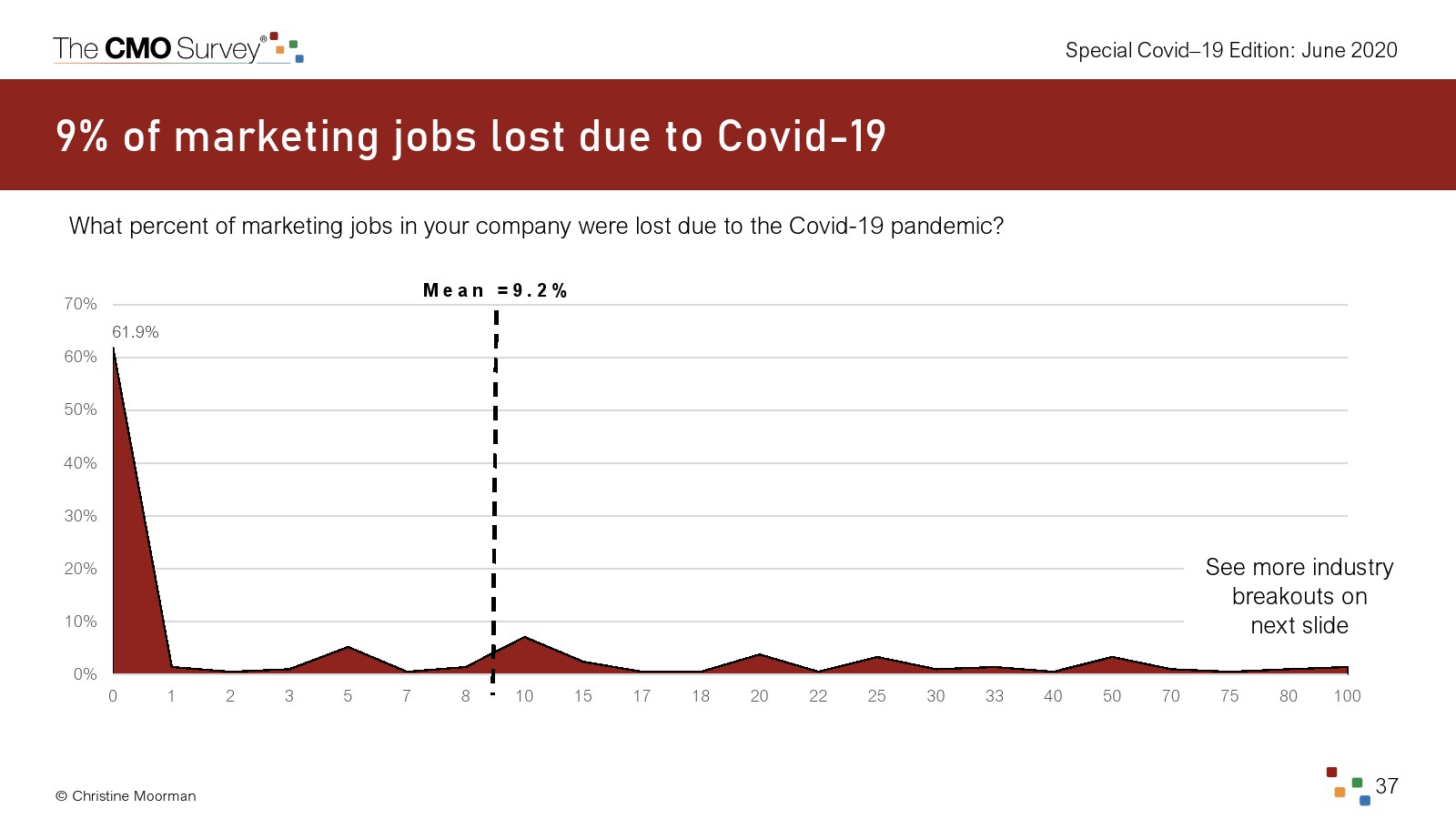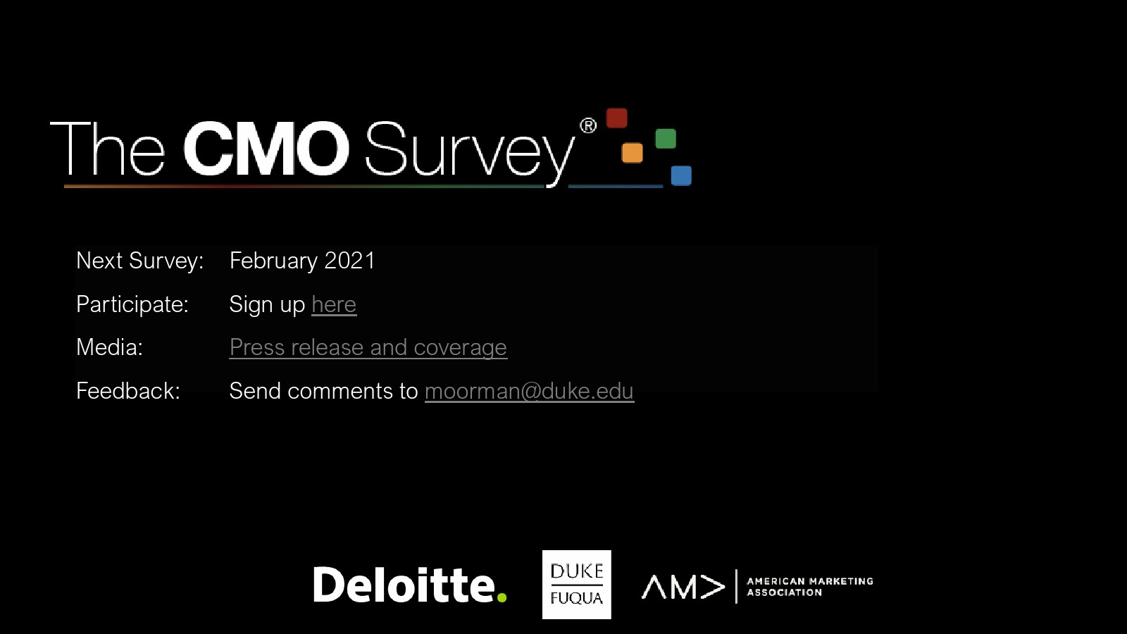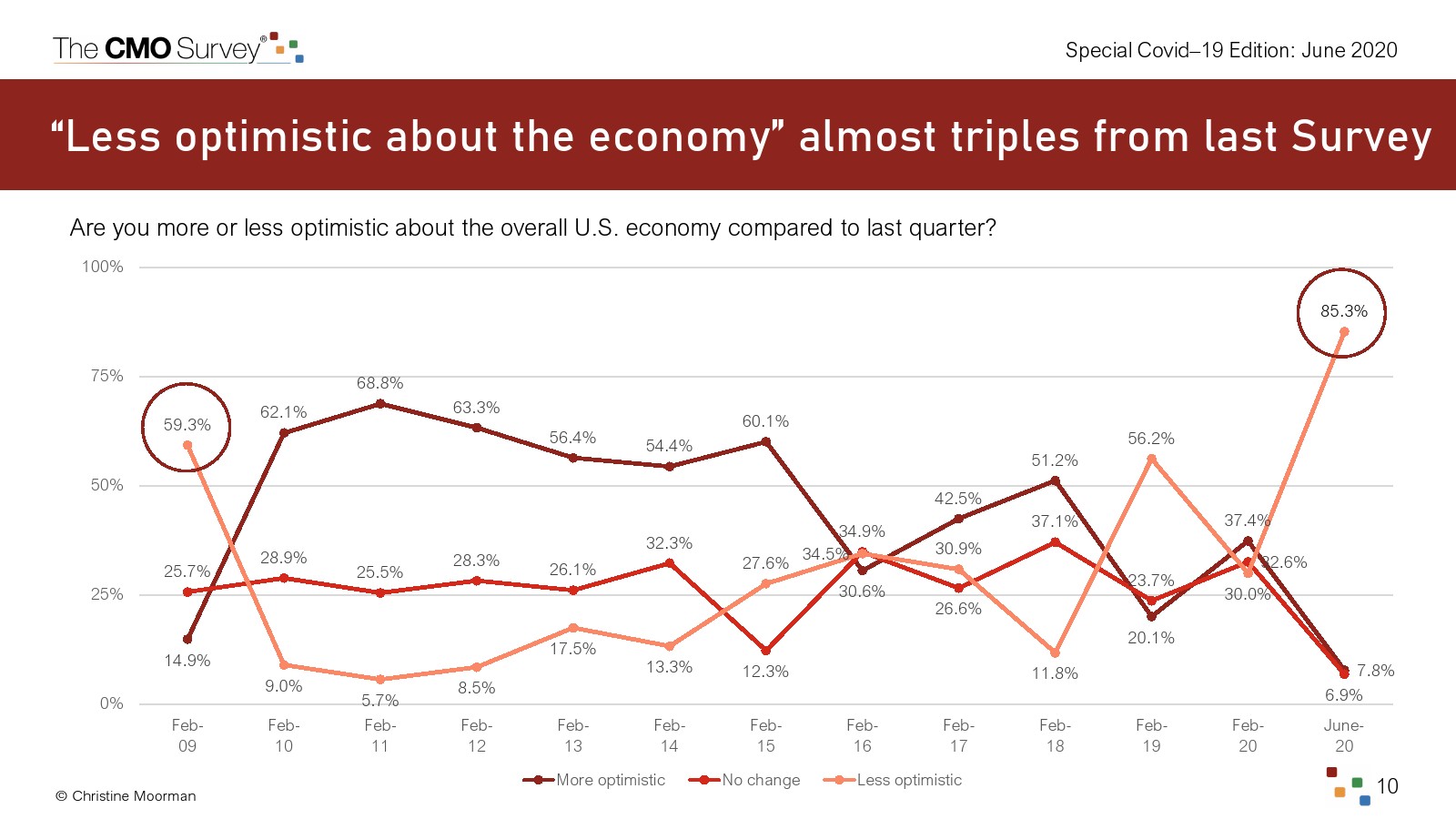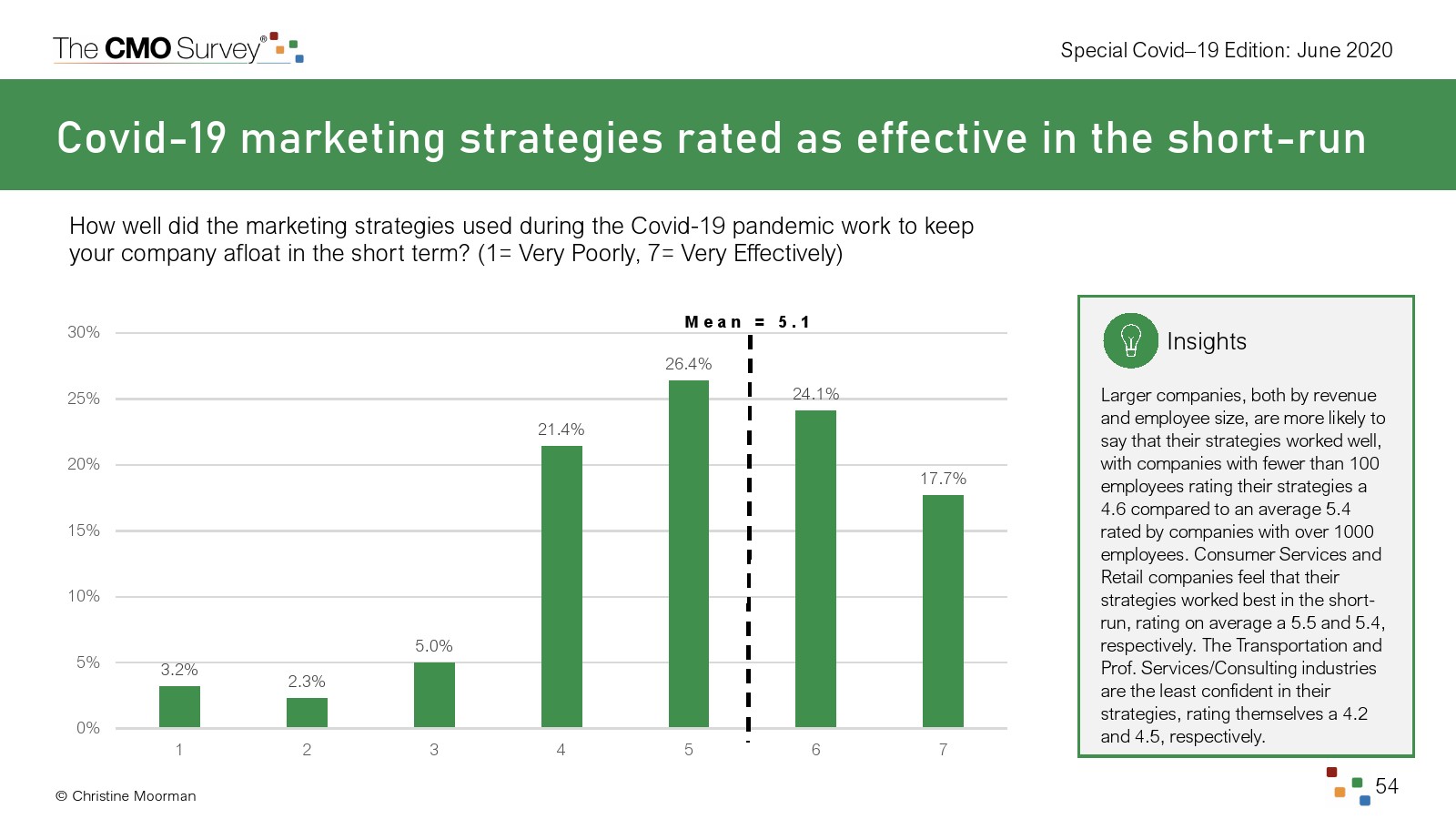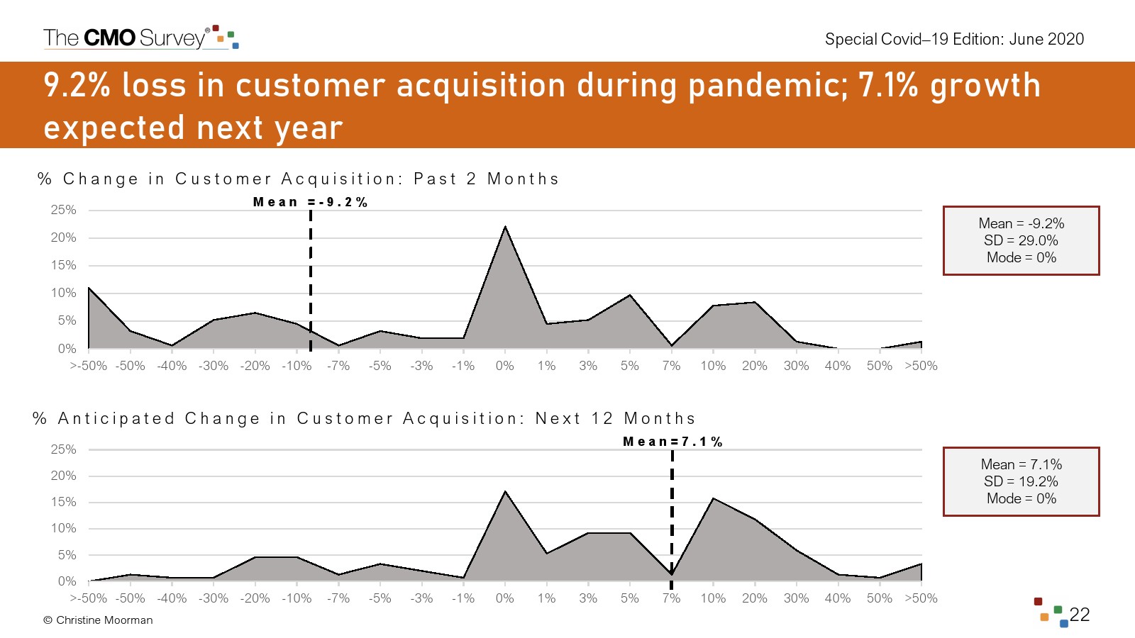 约2/3的受访者(65%)报告说,他们的产品和服务吸引了新客户。CMO还注意到,消费者不太可能购买(67%),也不愿支付全价(43%)。