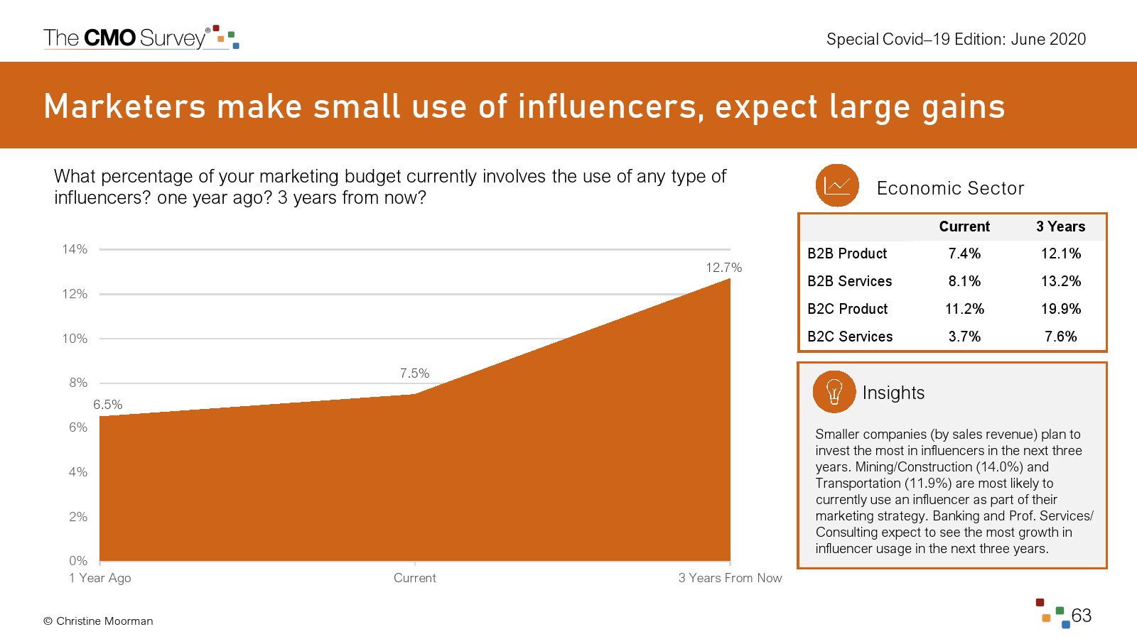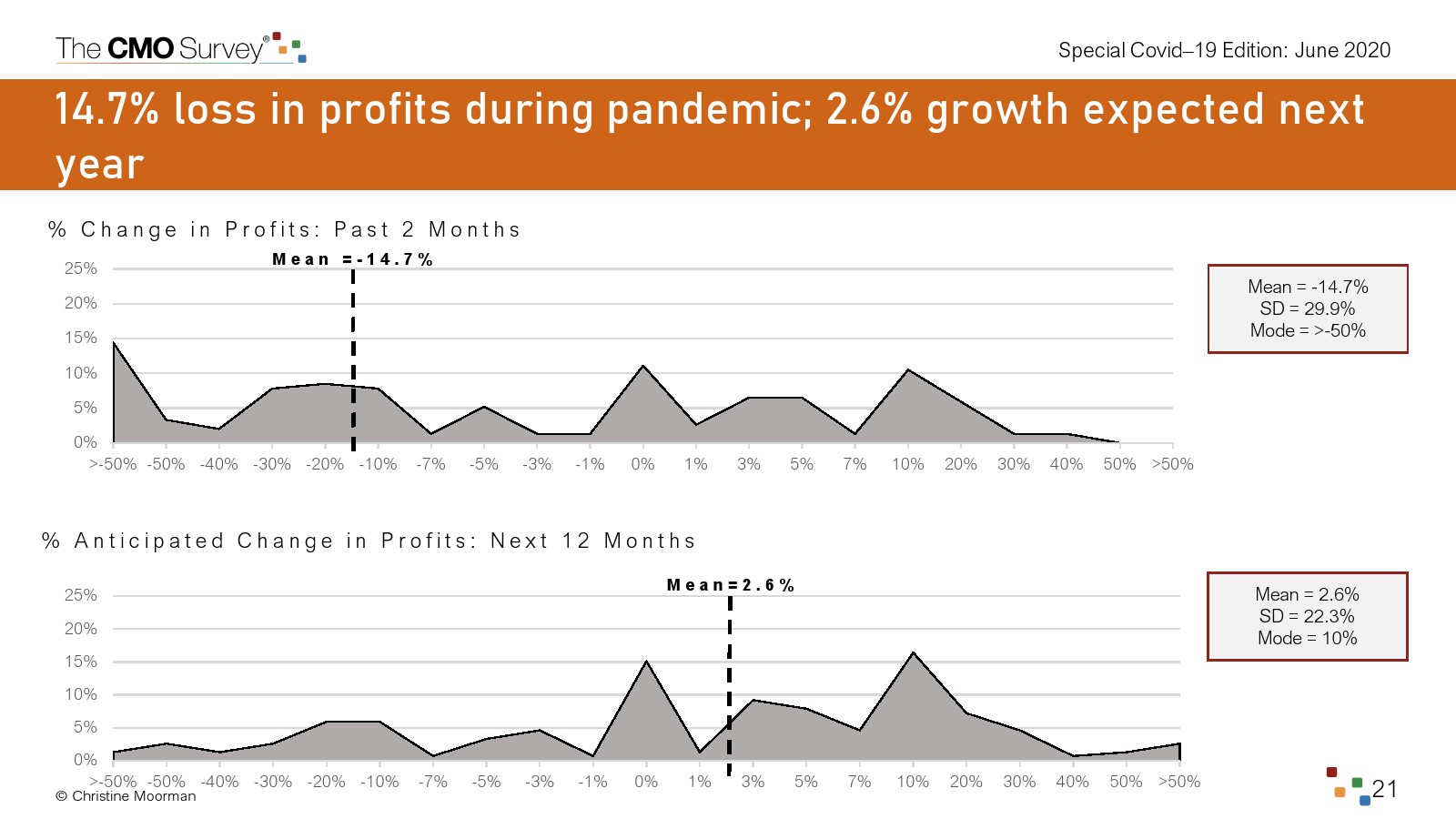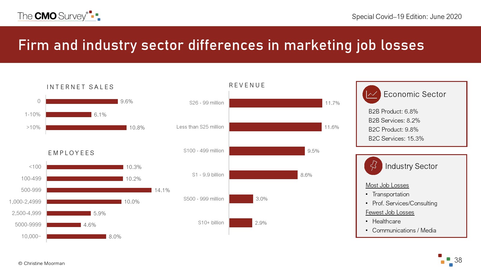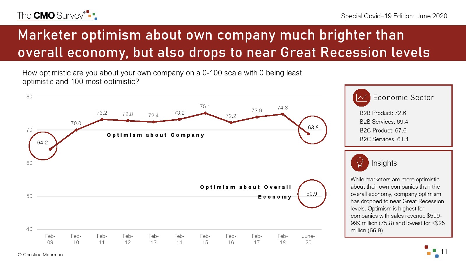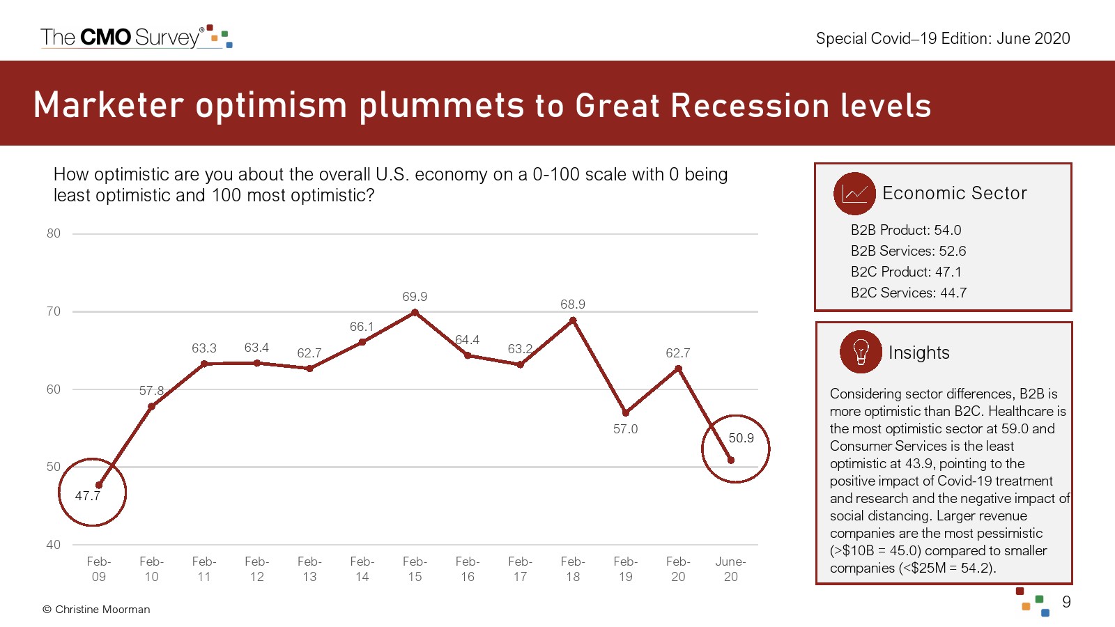 约2/3的受访者(65%)报告说,他们的产品和服务吸引了新客户。CMO还注意到,消费者不太可能购买(67%),也不愿支付全价(43%)。