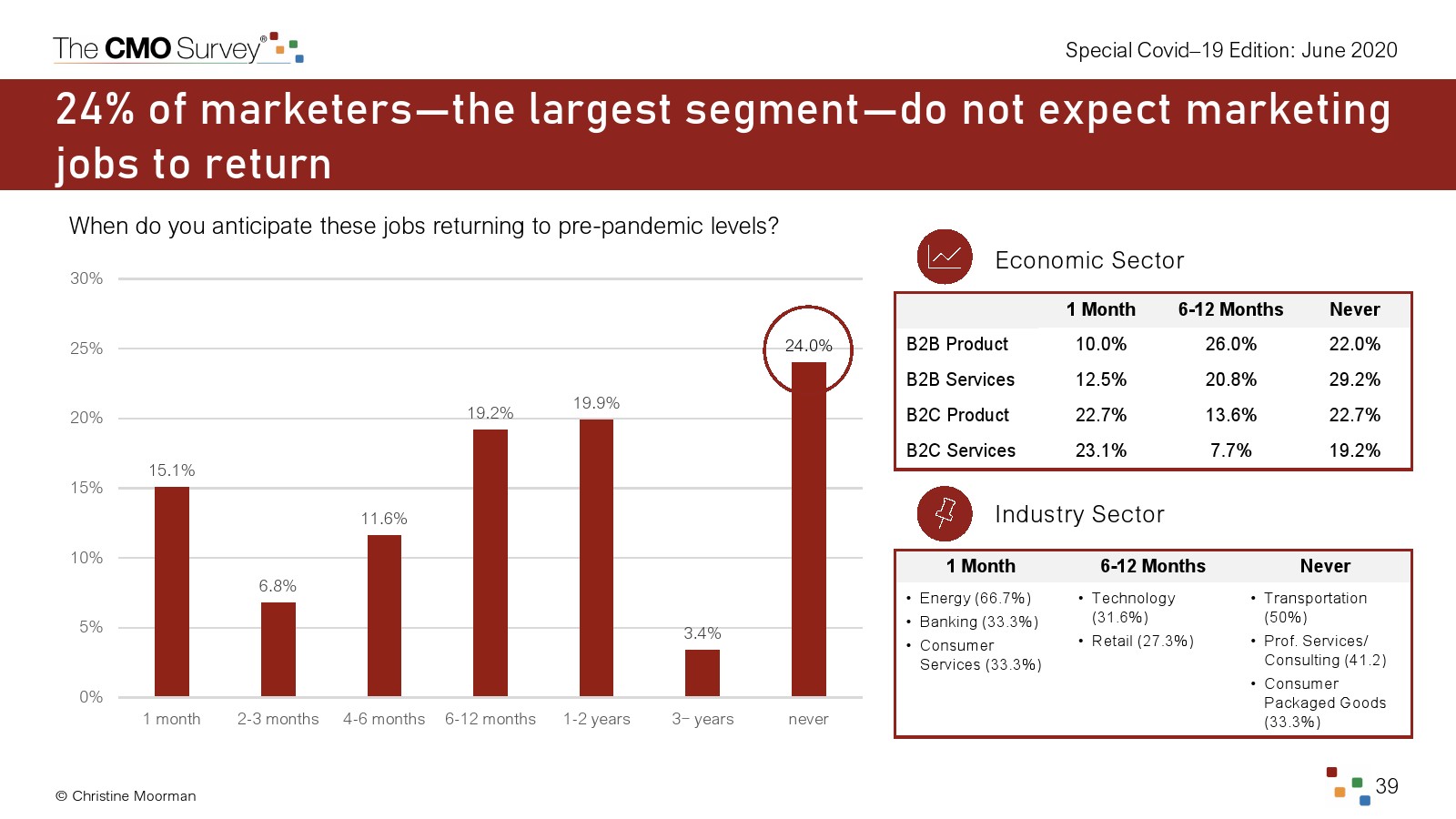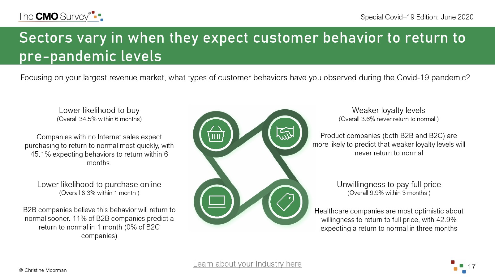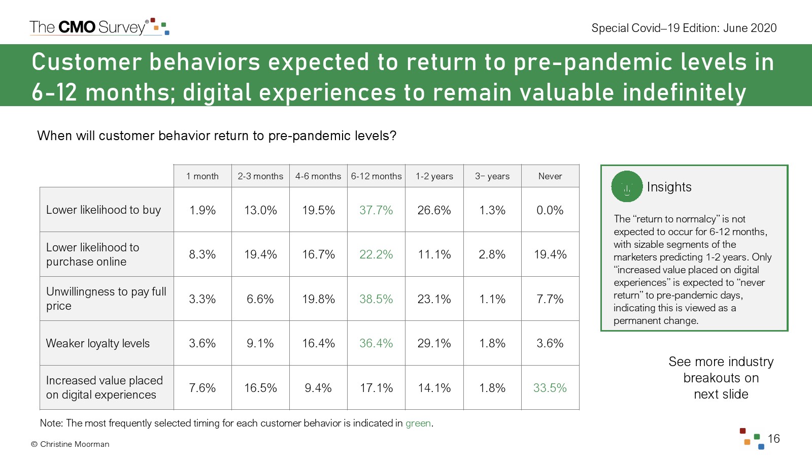 CMO乐观地认为,在大流行期间看到的几个消费者行为变化将在6-12个月内恢复正常。事实上,最大比例的受访者认为,不愿全额支付(38.5%)、购买可能性较低(37.7%)和忠诚度较低(36.4%)等行为将在这段时间内恢复到大流行前的水平,而不是在6个月或一年以后恢复。