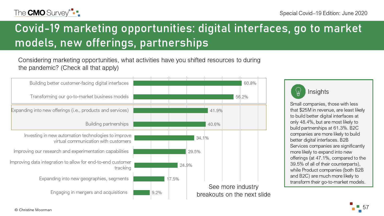 随着面对面参与的减少,85%的首席营销官(CMO)对大流行期间推出的新数字产品的开放程度有所提高;84%的CMO则见证了数字体验的价值增加。