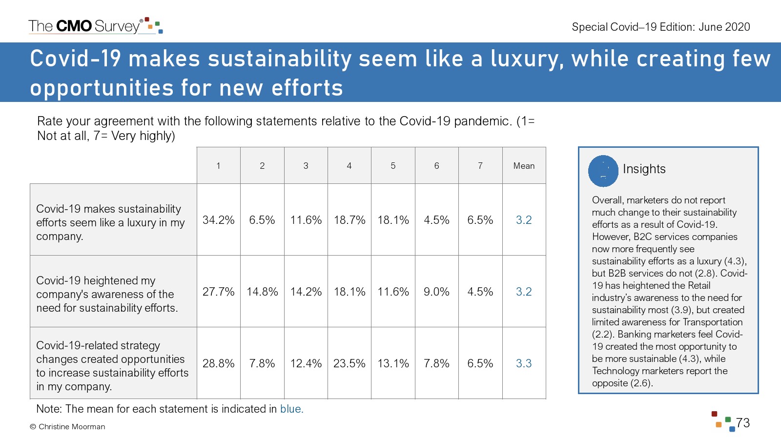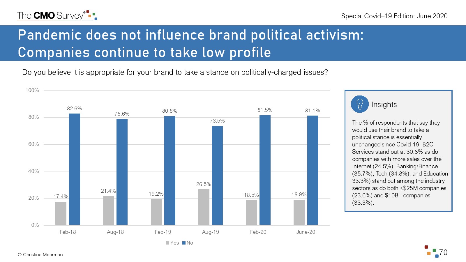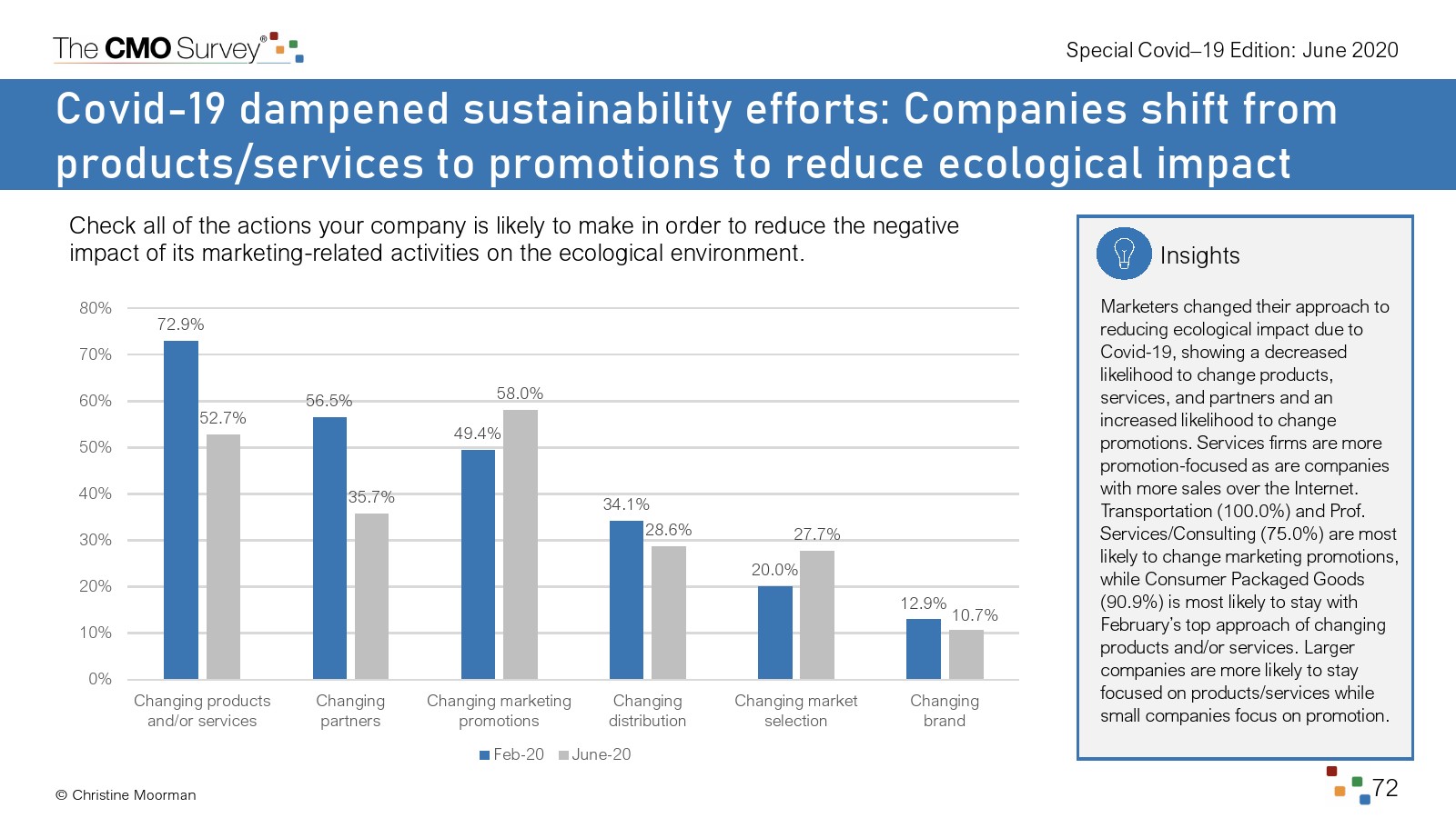 过去,美国消费者信任那些重视社会责任而不仅仅是利润的公司。因此,8/10的CMO(79%)对公司“行善”的尝试有了更多的认可。而且,虽然B2B公司一直在齐心协力将目标作为全公司倡议的一部分,但B2C公司比B2B公司更可能经历了客户行为的改变。
