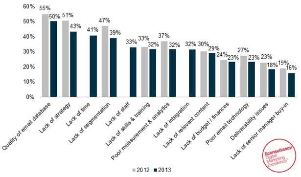 根据Econsultancy/Adestra 2013年最新的电子邮件营销调研,糟糕的数据质量是影响电子邮件营销效果的最大障碍