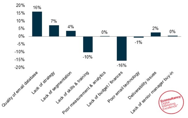 回顾2007年以来阻碍电子邮件成功的因素变化发现,邮件数据库的质量问题变得越来越普遍了,在过去六年间增长了16%。