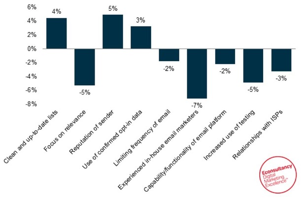 而回顾过去几年间邮件影响送达率的因素变化发现,干净和实时的LIST提升了4%,发送者的声誉提升了5%,许可邮件的数据提升了3%。而下降的因素主要体现对内部有经验的邮件营销人才的需求方面,看起来这方面没有一年前重要了,下降了7%。