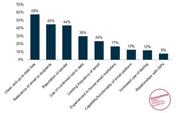 并不令人意外的是,58%的多数企业称干净和及时的邮件list对提升邮件送达率有最大的影响,比2012年增长了4%。然后提及较多的因素是邮件内容与接收者的相关性(45%),发送者的声誉(44%)