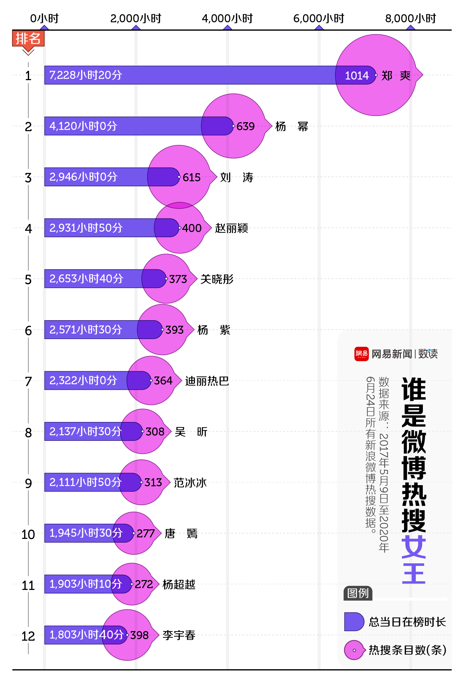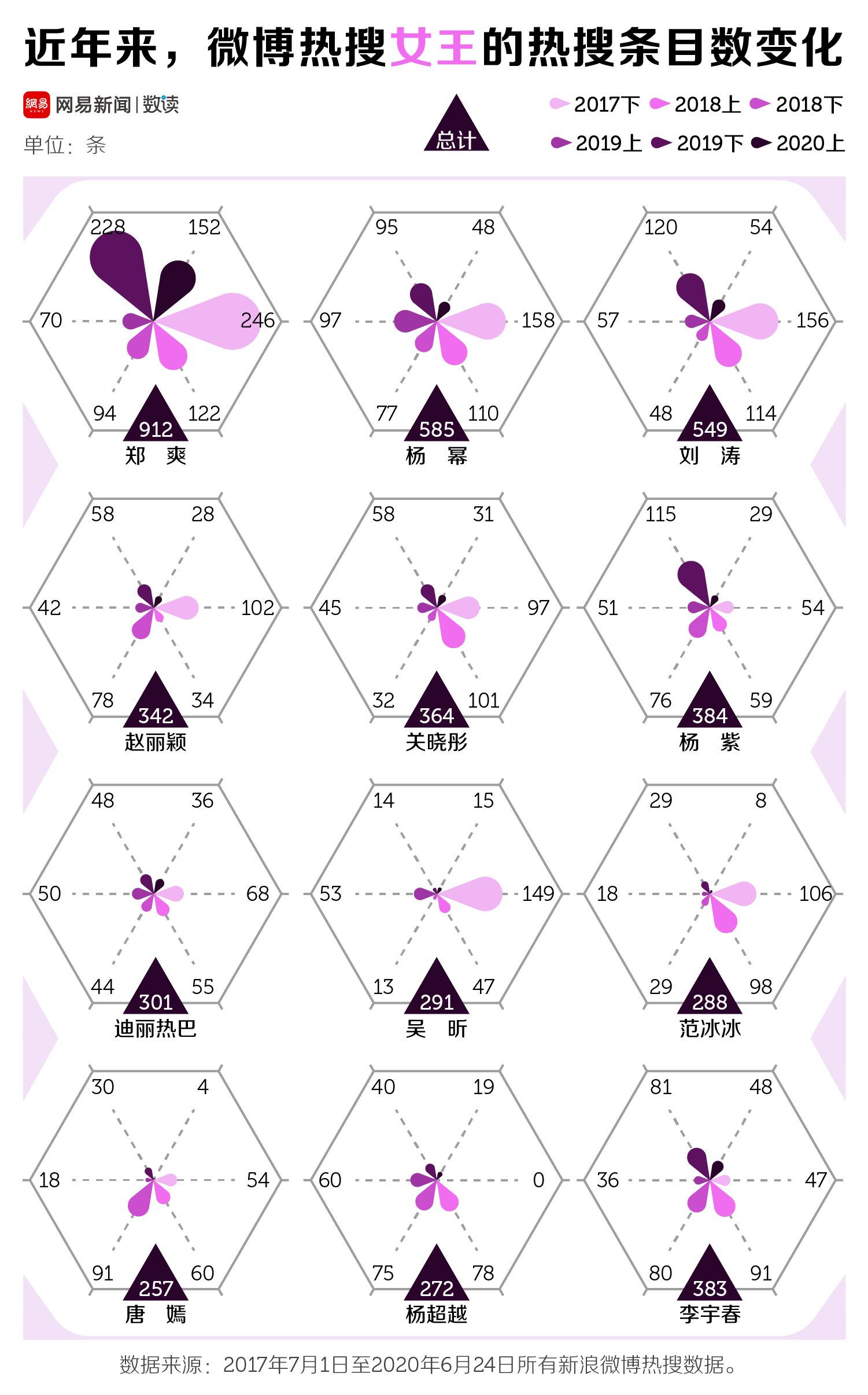 数据显示,郑爽以7228小时的总在榜时长、1014条的热搜条目总数遥遥领先。当红流量大花杨幂、赵丽颖、唐嫣无出其右。同为90后小花,关晓彤、杨紫、迪丽热巴三人热搜总条数加总起来,才将将和她打个平手。