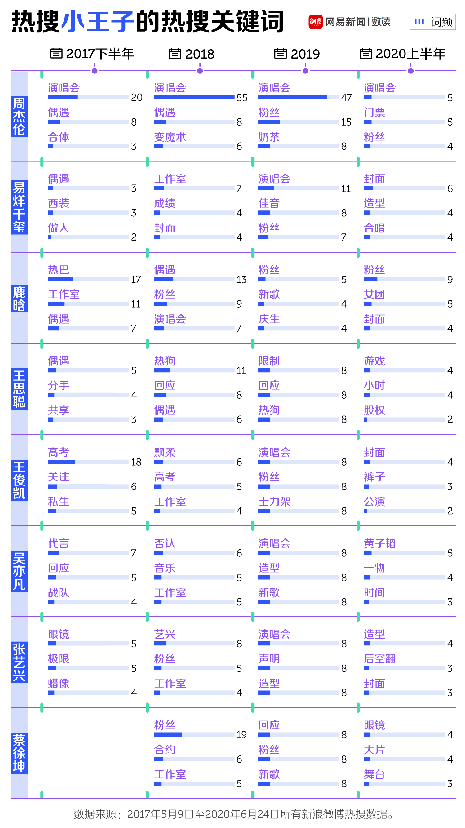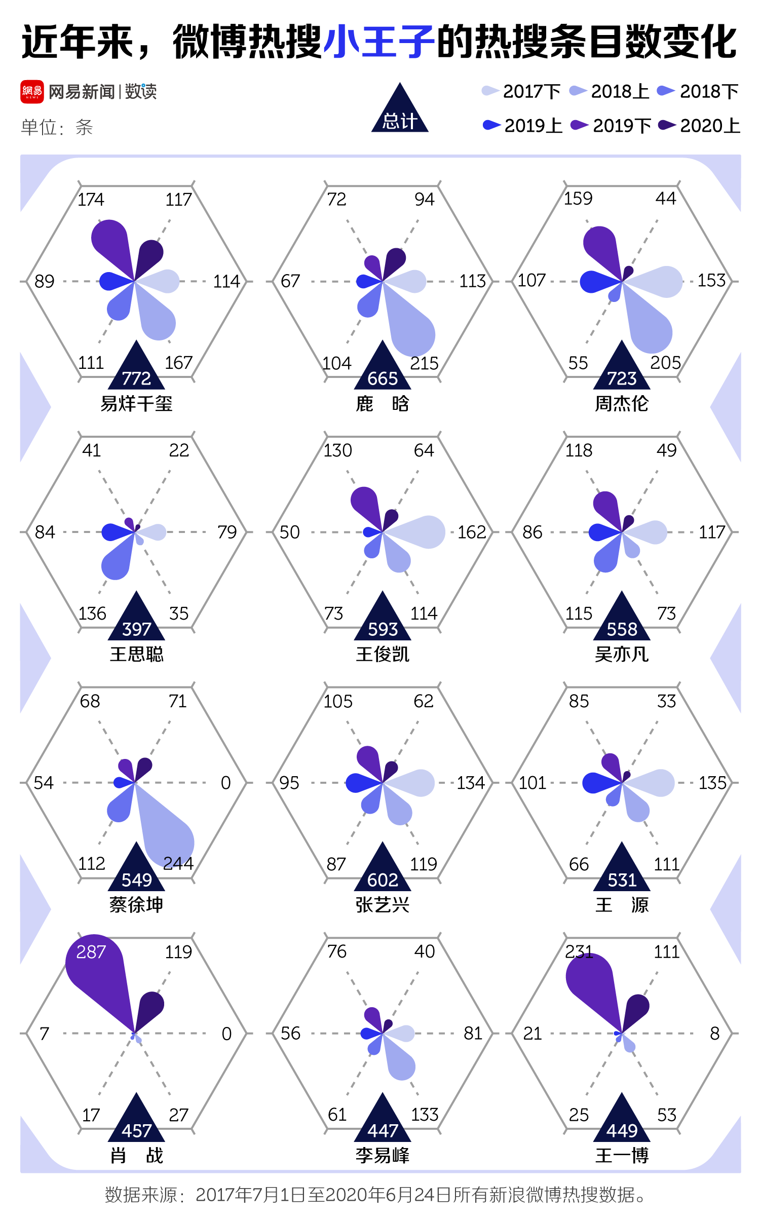 易烊千玺以4682小时的热搜总时长、795条热搜摘得“微博热搜小王子”的桂冠。王俊凯、王源则分别位列第5与第9。