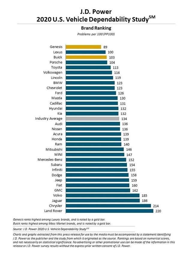 和新车销售满意度带来的购车指导意义相似,消费者在判断新车可靠性时,也倾向于以专业机构的各种排名和个人社交圈层的用车口碑作为指标,在今年一季度J.D. Power发布的《2020美国车辆可靠性研究(VDS)》报告中,别克品牌在非豪华品牌阵容中以103分的成绩列居榜单前列。
