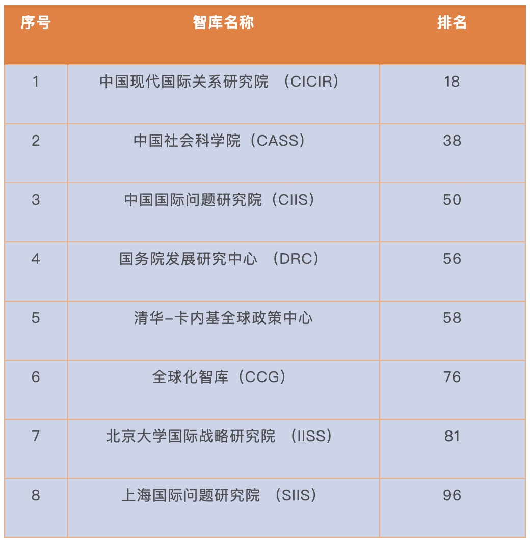 近年来,党中央、国务院已经多次强调要建设中国特色新型智库,对建设中国特色社会智库作了全面系统的顶层设计并出台高端智库建设办法,支持、鼓励、推动中国各类智库健康有序发展,智库实力整体稳健上升。同时,中国智库在全球治理和多边外交中发挥着越来越重要的作用,在国际舞台上来自中国智库的声音越来越多。《报告》全球顶级智库综合榜单中,中国现代国际关系研究院、中国社会科学院、中国国际问题研究院、国务院发展研究中心、清华-卡内基全球政策中心、全球化智库(CCG)、北京大学国际战略研究院 (IISS)、上海国际问题研究院等8家中国智库连续两年入选全球百强智库榜单。其中,CCG是入选全球百强榜单的唯一社会智库。