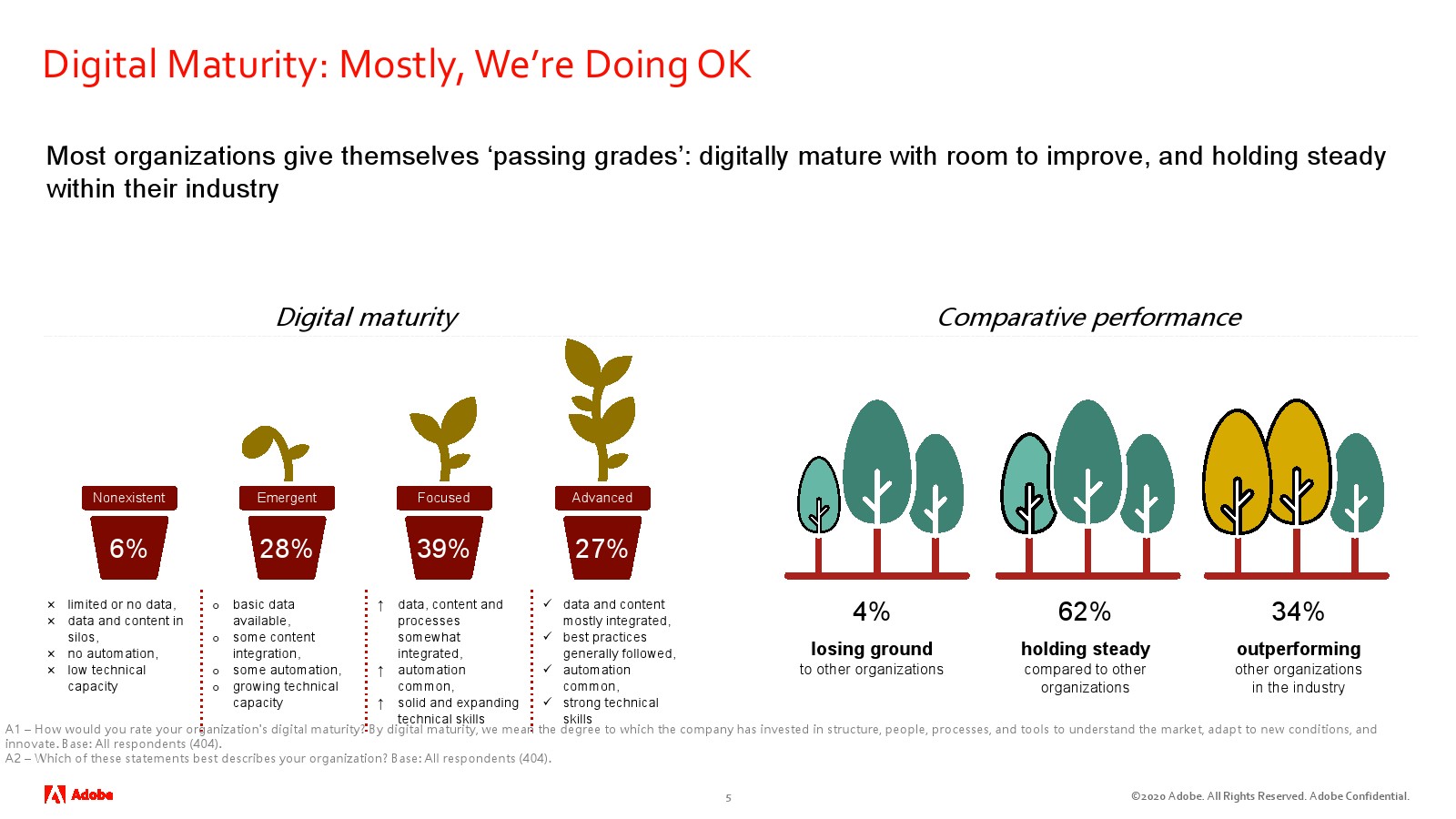 66%的受访者认为他们的数字成熟度是先进的;62%的受访者认为自己的个性化“保持稳定”;34%的受访者认为他们的企业表现优于同行业的其他企业。