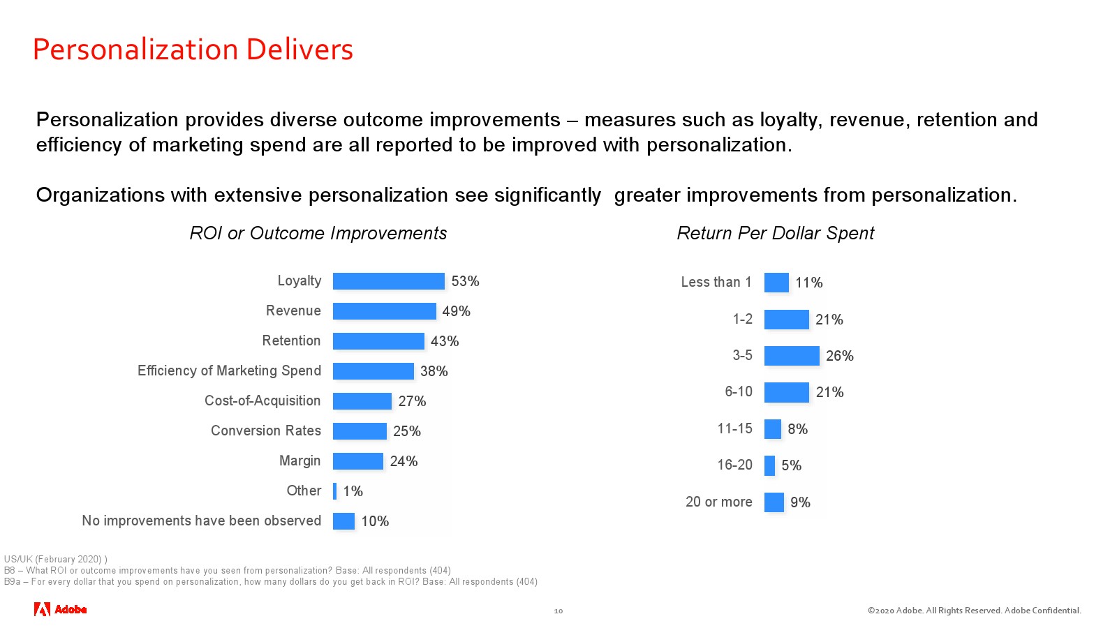 个性化对获得客户的成本(27%)、转化率(25%)和利润率(24%)的影响较小。但是,只有1/10的受访者完全没有从个性化中获益。9%的受访者表示投资回报率达到或超过20倍。
