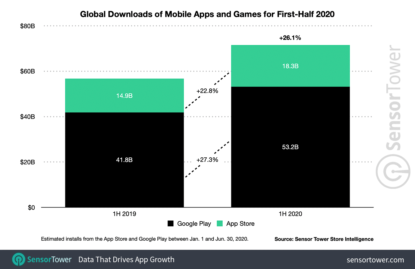 2020年上半年有715亿次应用安装量,同比增长26.1%,其中App Store贡献183亿安装量,比2019年上半年(149亿次)增长22.8%。