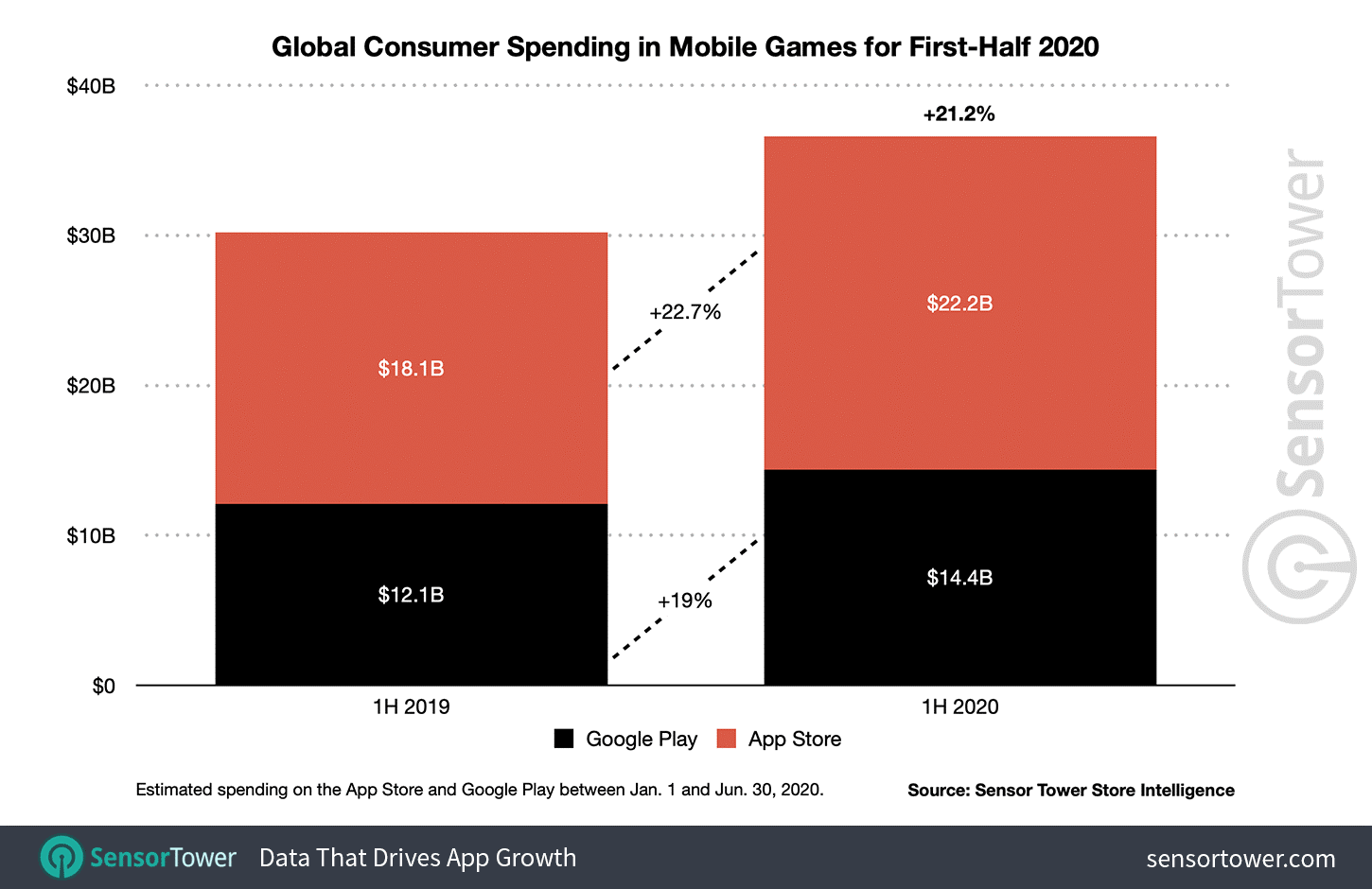 2020年上半年,手机游戏收入同比增长21.2%,估计为App Store和Google Play带来了366亿美元的收入。