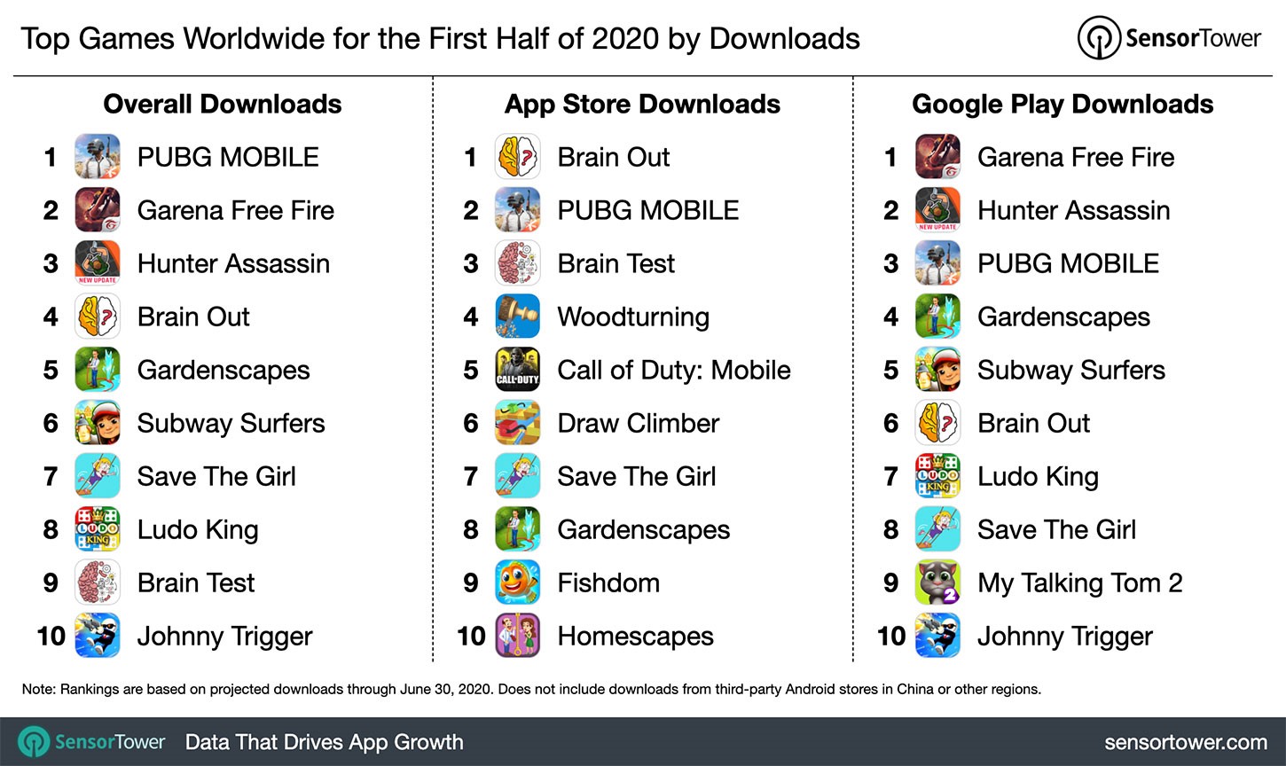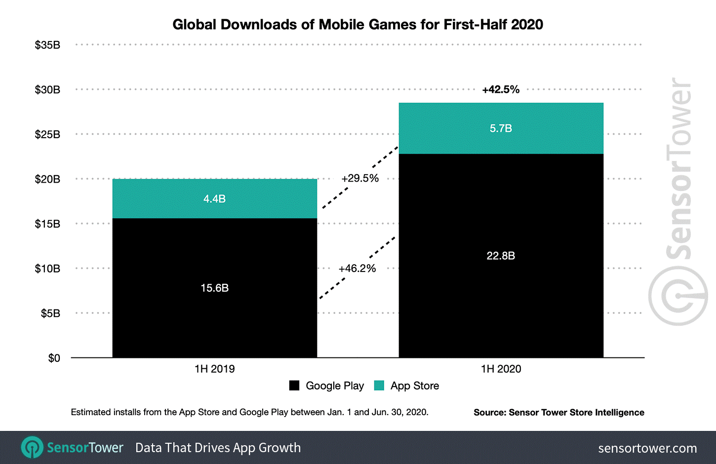 2020年上半年,手机游戏下载量呈上升趋势。全球App Store和Google Play的游戏安装总量为285亿次。这比2019年同期增长了42.5%,2019年同期的安装量约为200亿次。