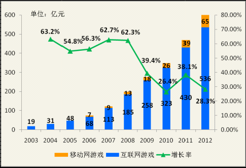 2012年,以互联网和移动网游戏市场计算,我国网络游戏市场收入规模达601.2亿元,同比增长28.3%。其中,互联网游戏536.1亿元,同比增长24.7%;移动游戏65.1亿元,同比增长68.2%。