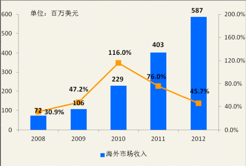 据不完全统计,2012年新增出口游戏66款,累计出口国产网络游戏产品数量已经突破260款(自2010年起),参与出口的网络游戏企业接近100家。2012年自主研发网络游戏海外收入达5.87亿元,国产网络游戏海外出口态势稳步发展。