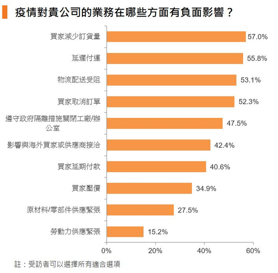 受疫情影响的受访者中,57%指出,自疫情爆发以来,买家已减少订货量,而逾半(52.3%)受访者表示买家取消订单。其他与疫情相关的影响包括货物延迟付运(55.8%)及物流配送受阻(53.1%)。在极端情况下,约47.5%受访者表示须遵守政府隔离封锁措施而关闭工厂/办公室。