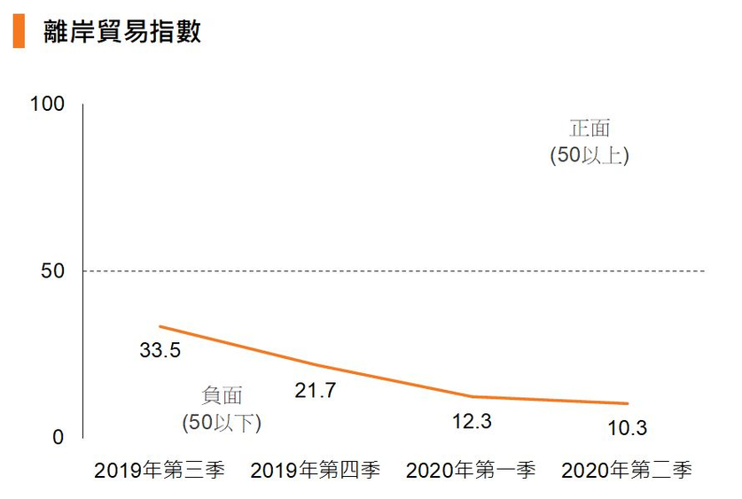 由于预期出口前景暗淡,许多受访者同样对离岸贸易(并非经香港付运但由香港出口商处理的贸易)的短期表现缺乏信心。2020年第二季的离岸贸易指数下跌2.0点至10.3,为有纪录以来新低,正好反映上述情况。