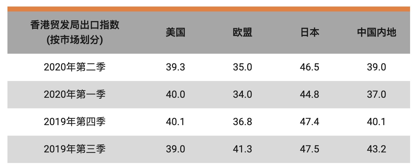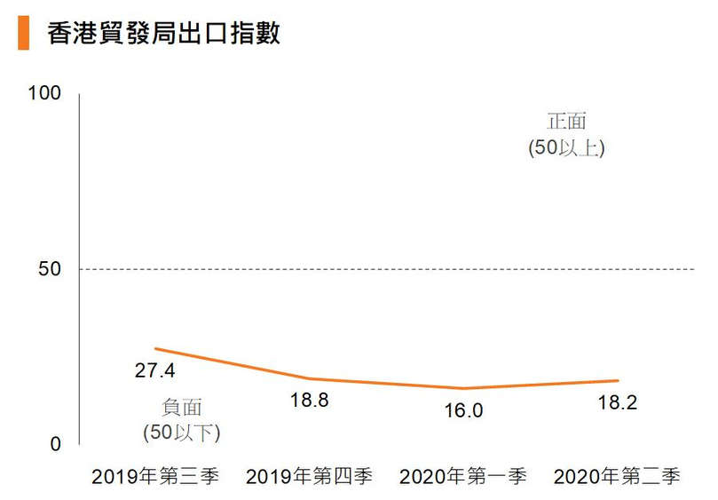 - 香港贸发局出口指数于2020年第二季为18.2,较上一季纪录低位的16.0微升2.2点。不过,指数仍然处于收缩领域的低点,显示香港出口前景难于短期内大幅改善。