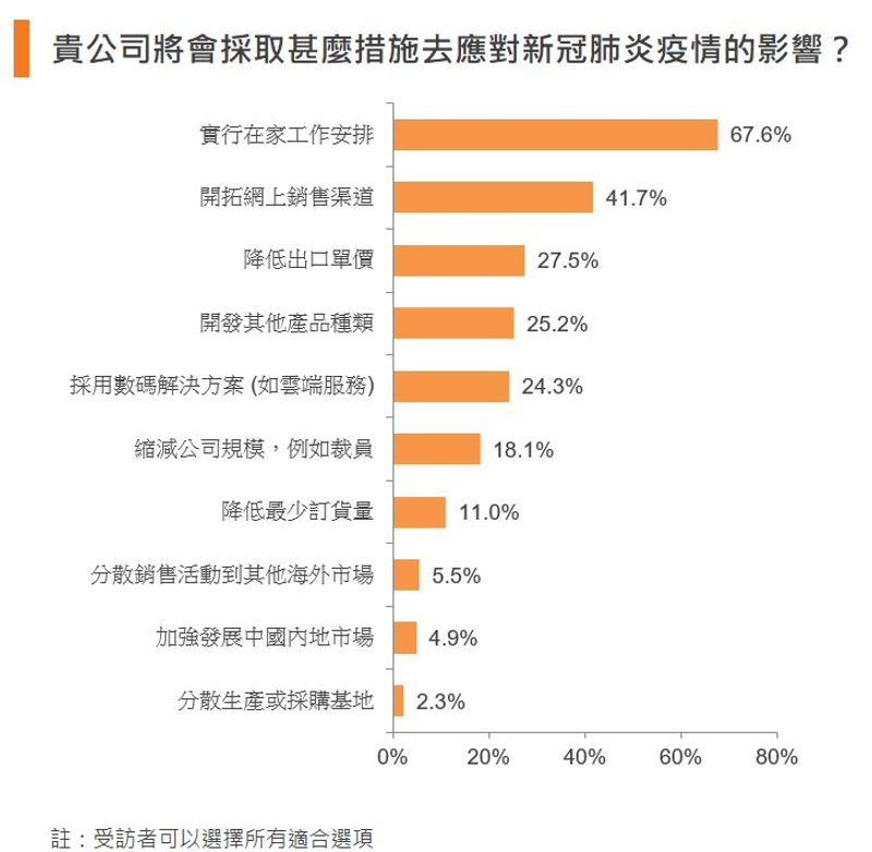 - 为了应对疫情,67.6%的受访者实行遥距工作,另有41.7%也开拓网上销售渠道,以补足传统销售方式。