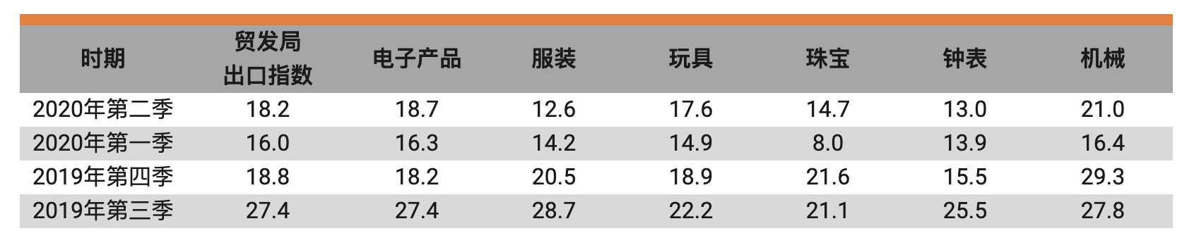 少数行业的出口商信心略有改善,令人存有一点希望。最值得注意的是,2020年第二季机械业及电子产品业的表现依然较平均水平为高,相关指数分别升至21及18.7,增幅为4.6点及2.4点。玩具业的指数也有改善,升至17.6,增幅为2.7点。珠宝业由2020年第一季纪录低位的8,大增6.7点至第二季的14.7,增幅为各行业之冠。不过,值得留意的是,玩具业及珠宝业依然低于整体平均水平的18.2。钟表业及服装业则分别进一步下跌至13.0及12.6,跌幅为0.9点及1.6点,显示相关行业的短期出口仍将疲弱。