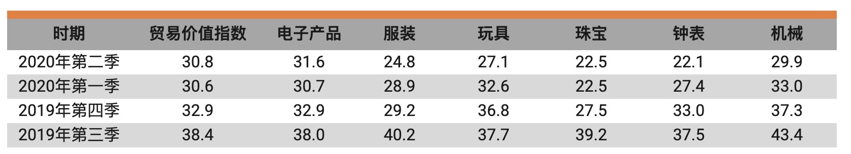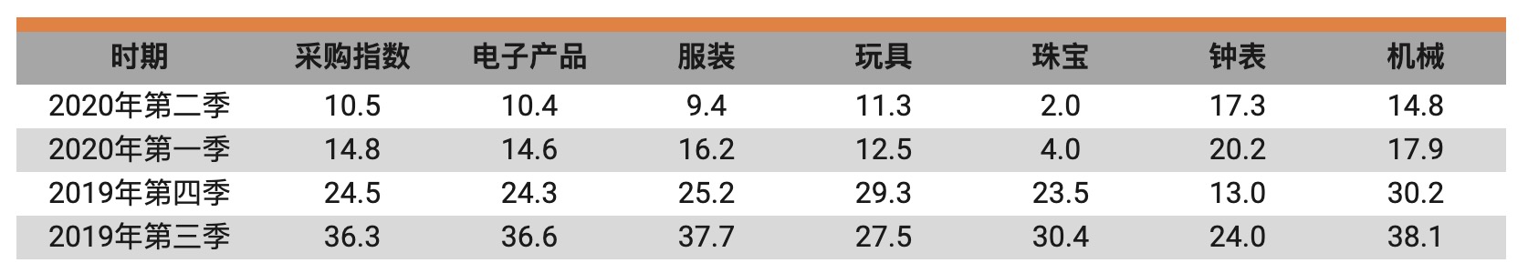 采购指数进一步下跌4.3点至10.5,创下纪录新低。钟表业依然是表现最好的行业,指数为17.3。其他所有主要行业的采购指数都进一步在收缩领域下跌,并达到纪录新低,其中机械业为14.8,玩具业为11.3,电子产品业为10.4,服装业为9.4。珠宝业则由2020年第一季的4.0下跌至2.0,而2020年第一季与2019年第四季相比已大幅下跌19.5点。