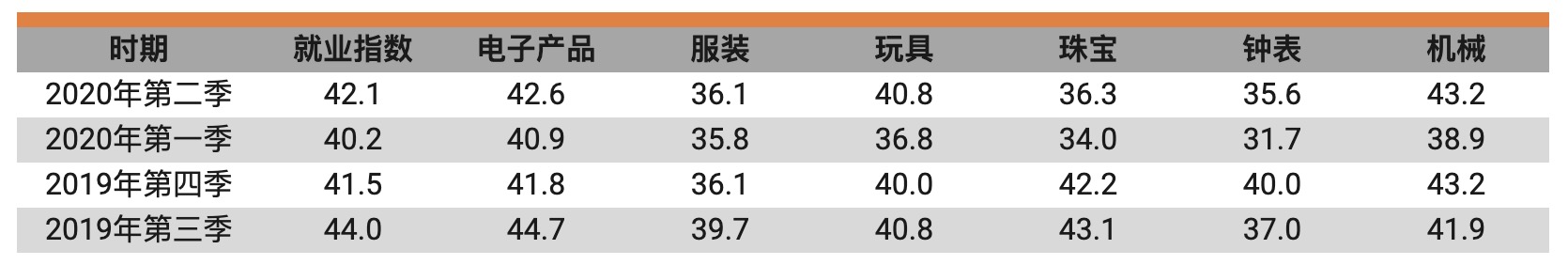 就业指数的表现相对较好,于2020年第二季上升1.9点至42.1,反映许多与出口相关的行业在可见未来的招聘活动会保持稳定。在主要行业之中,机械业的就业指数升幅最大(上升4.3点至43.2),其后是电子产品业(上升1.7点至42.6)。玩具业(40.8)、珠宝业(36.3)及服装业(36.1)的指数增幅介乎0.3点至4点。钟表业的就业指数虽然按季增加3.9点,但依然是表现最差的行业,意味著行业雇员数目很可能会减少。