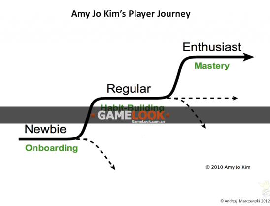 那么我们如何充分利用游戏中的奖励?不过首先看以下我做的玩家旅程图。在这里我们使用Amy Jo Kim的玩家旅程作为一个比喻,其中有三个阶段,分别是初步接触,习惯养成,和轻车熟路。奖励和积分真正有帮助的阶段是接触阶段和习惯养成阶段。