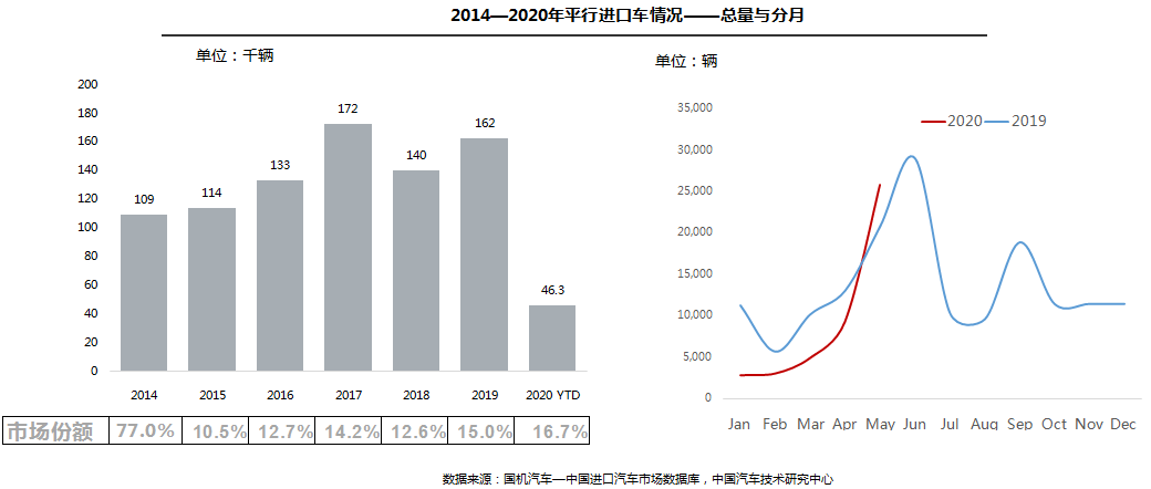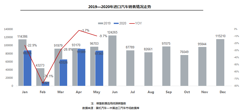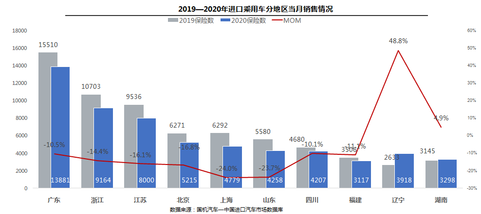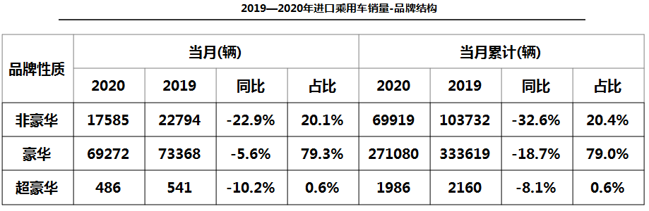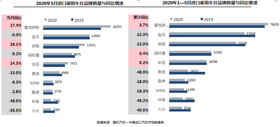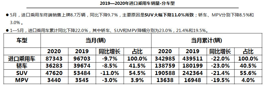 中国汽车流通协会:2020年5月份中国进口汽车市场 市场供给:2020年1—5月,全球疫情影响扩大,全国累计进口汽车27.8万辆,同比累计降幅为36.9%。5月,全球疫情影响持续发酵,单月进口汽车4.0万辆,同比降幅60.7%,乘用车占比95%。 销售情况:1—5月,进口乘用车销售34.3万辆,累计同比下滑22.0%;5月,进口汽车销售8.7万辆,同比下滑9.7%,相比上月降幅有所扩大。 平行进口汽车:受惠于国6政策延期,5月,平行进口汽车2.6万辆,环比大幅增长175.5%,进口量仅次于去年6月的历史峰值;1—5月平行进口汽车4.6万辆,同比下降24.1%,占进口总量的16.7%,与2019全年市场份额相比增加1.7个百分点。 车型结构:1—5月,进口销售车型仍以轿车和SUV为主,占比超过96%;进口乘用车累计同比下降22.0%,其中轿车、SUV和MPV降幅分别为23.0%,21.4%和19.5%。 级别结构:2020年1-5月,大型和中大型进口车细分市场份额相比2019年均有所提升,分别提高1.9和6.1个百分点;其他细分市场份额均有所减少,其中,中型和紧凑型进口车份额分别减少4.5和2.6个百分点。数据显示疫情对中高端市场影响相对较小。 品牌结构-整体市场:1—5月,豪华品牌仍是销售主力,占销售总量的79.0%,下滑18.7%,非豪华品牌、超豪华品牌分别下滑32.6%和8.1%。 5月,非豪华品牌、豪华品牌和超豪华品牌分别下滑22.9%、5.6%和10.2% 品牌结构-细分品牌:1—5月,进口品牌格局稳定,前三名依然是雷克萨斯、宝马和奔驰;雷克萨斯受ES车型,保时捷受Macan车型,丰田受平行进口拉动,实现小幅增长,其余品牌均下降。5月,前十品牌中只有雷克萨斯、奔驰、丰田品牌实现增长,其余品牌均下降。 区域结构:5月,全国销售前三的省份仍然是广东、浙江、江苏。销售前十的省份中辽宁、湖南因同期基数低,分别增长48.8%和4.9%;其余省份均出现下滑,上海、山东下滑幅度较大,降幅超过20%。 更多阅读:中国汽车流通协会:2020年4月中国进口汽车市场月报中国汽车流通协会:2022年8月中国进口汽车市场情况分析国机汽车:2021年10月中国进口汽车市场月报中国汽车流通协会:2020年第一季度豪华品牌新增授权4s店57家 退网4s店41家中国汽车流通协会:2022年6月中国进口汽车市场情况分析中国汽车流通协会:2022年5月中国进口汽车市场情况中国汽车流通协会:2022年4月中国进口汽车市场情况中国汽车流通协会:2022年4月中国进口汽车市场情况分析中国汽车流通协会:2022年3月中国进口汽车市场情况中国汽车流通协会:2022年2月中国进口汽车市场月报中国汽车流通协会:2020年8月中国进口汽车市场月报中国汽车流通协会:2022年7月中国进口汽车市场情况中国汽车流通协会:2022年7月中国进口汽车市场情况中国汽车流通协会:2024年5月中国进口汽车市场情况中国汽车流通协会:2024年4月中国进口汽车市场情况