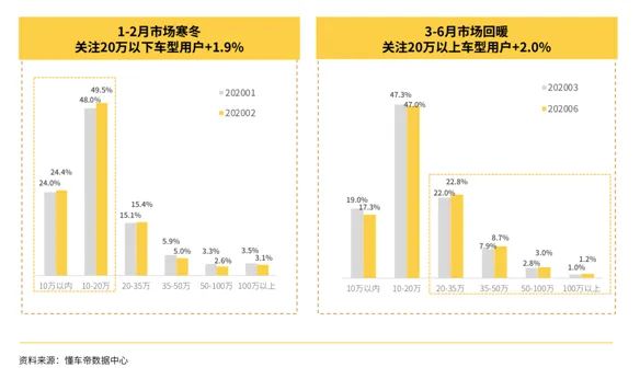 《报告》指出,疫情初期,考虑到购车需求和经济大环境影响,用户更关注于20万以下车型。3-6月疫情逐渐稳定后,关注20万以上车型的用户数,出现小幅增长,并且,豪华车3-6 月购车意向增幅是大盘6.3倍之多。