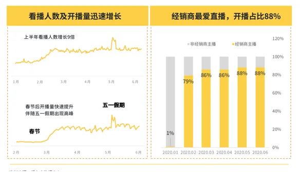 事实上,直播确实在越来越多地参与汽车交易,这种易于年轻用户接受的形式,正起到重要作用。据《报告》显示,五一后车市回暖后,车企和经销商仍然没有放弃直播营销的方式,并出现开播峰值。同时,直播间的潜在客户数量也在提升,今年1月至6月该数字提升了近100倍。