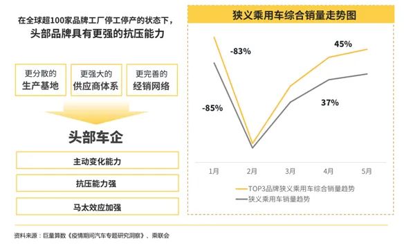 在寒冬之下,头部车企更具抗压优势。《报告》指出,TOP3品牌狭义乘用车综合销量增长趋势,超过狭义乘用车销量增长趋势8%,而且这样差距还将继续拉大。