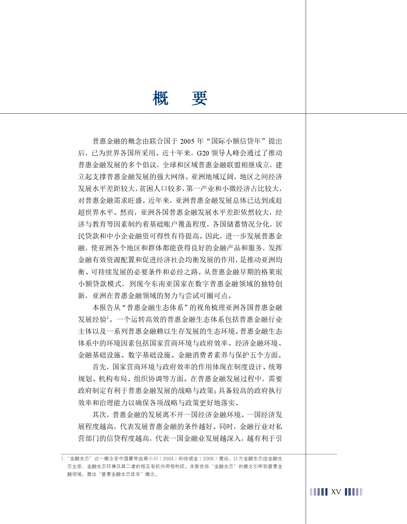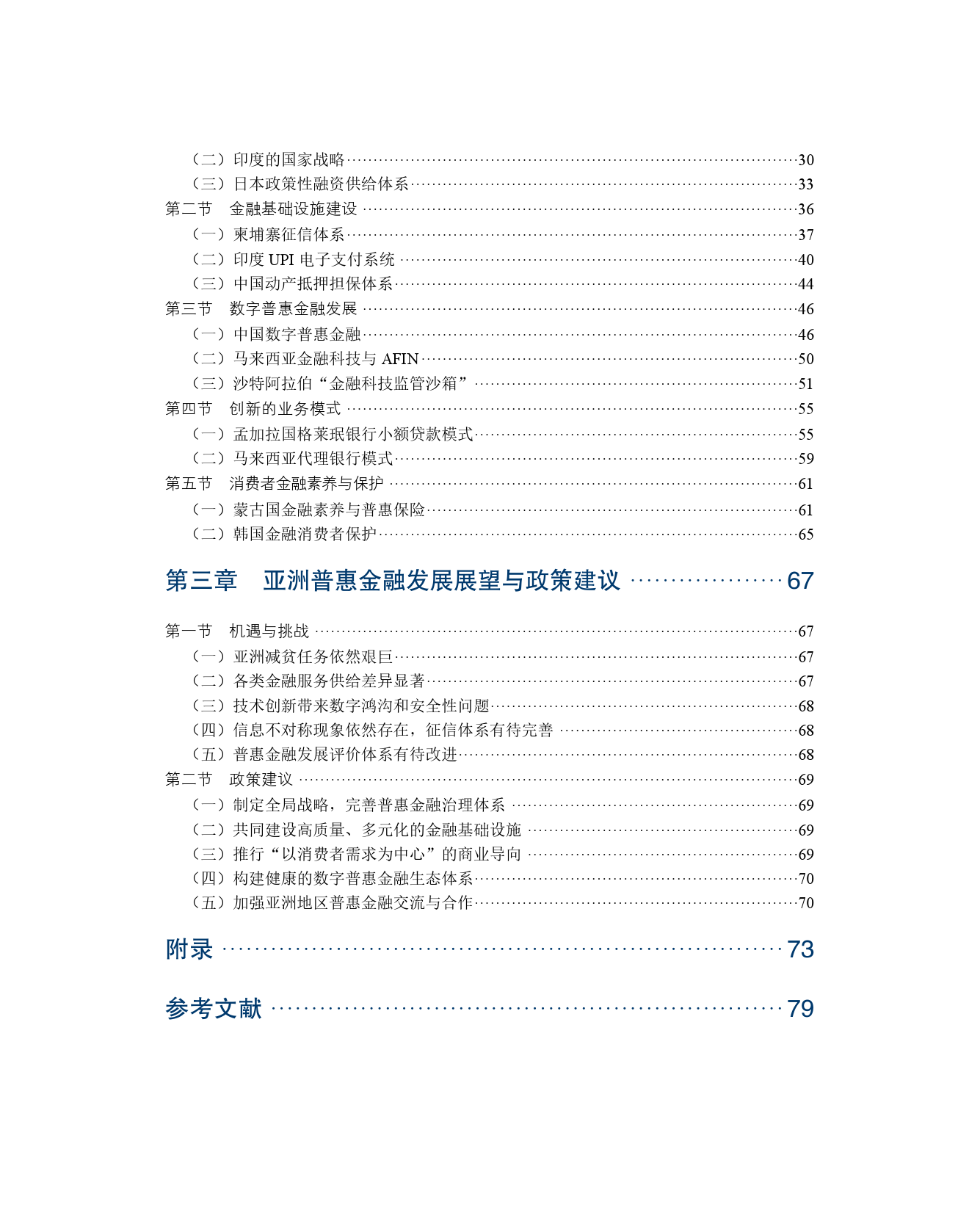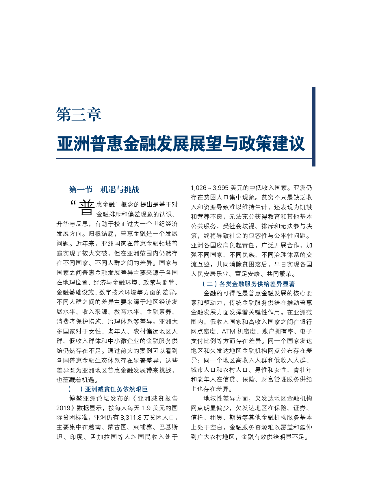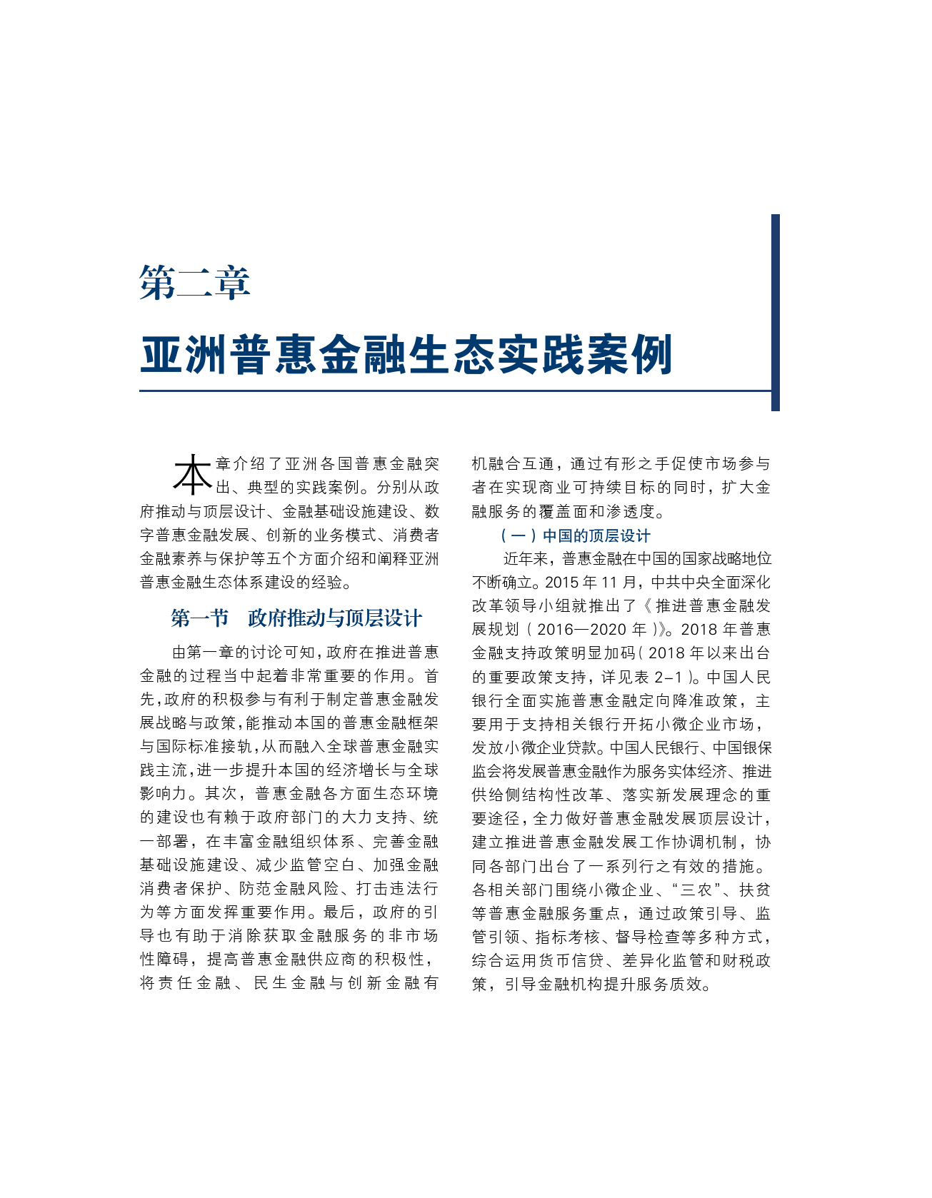 报告从普惠金融生态体系的视角梳理了亚洲各国普惠金融发展经验,如中国在国家战略、货币信贷、财税政策、治理框架和机构能力等方面为普惠金融发展作出的努力,柬埔寨在全国性征信体系建设方面取得的成就,蒙古国与韩国在金融消费者素养、普惠保险服务、消费者保护领域作出的努力和取得的显著效果等。