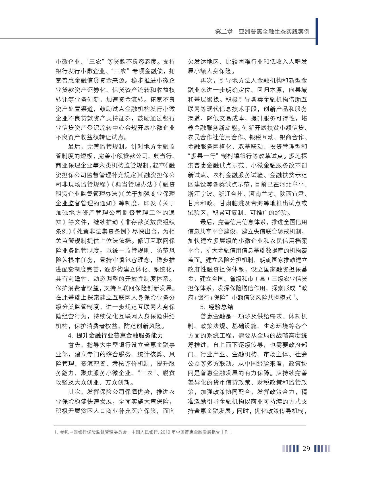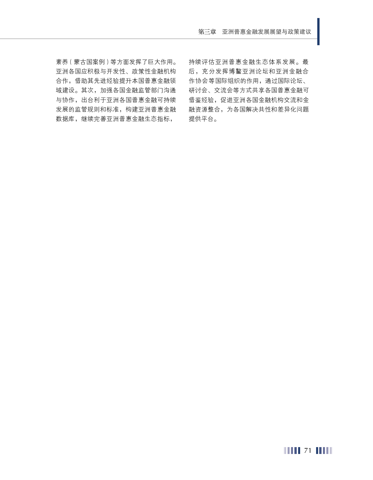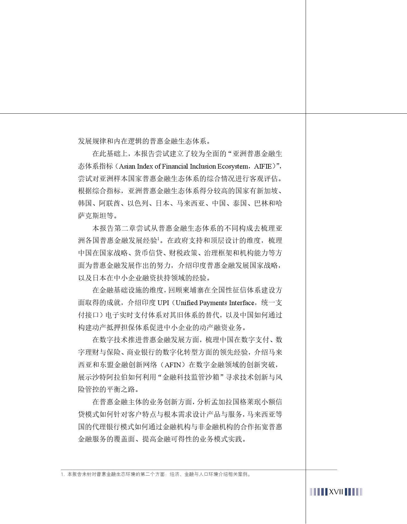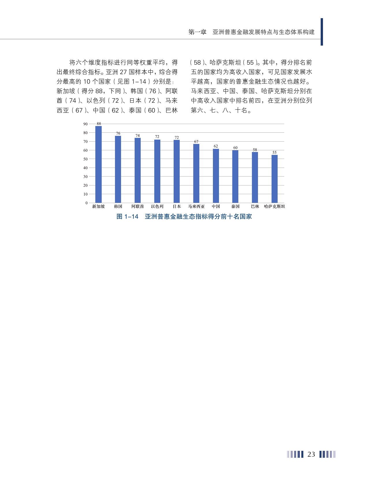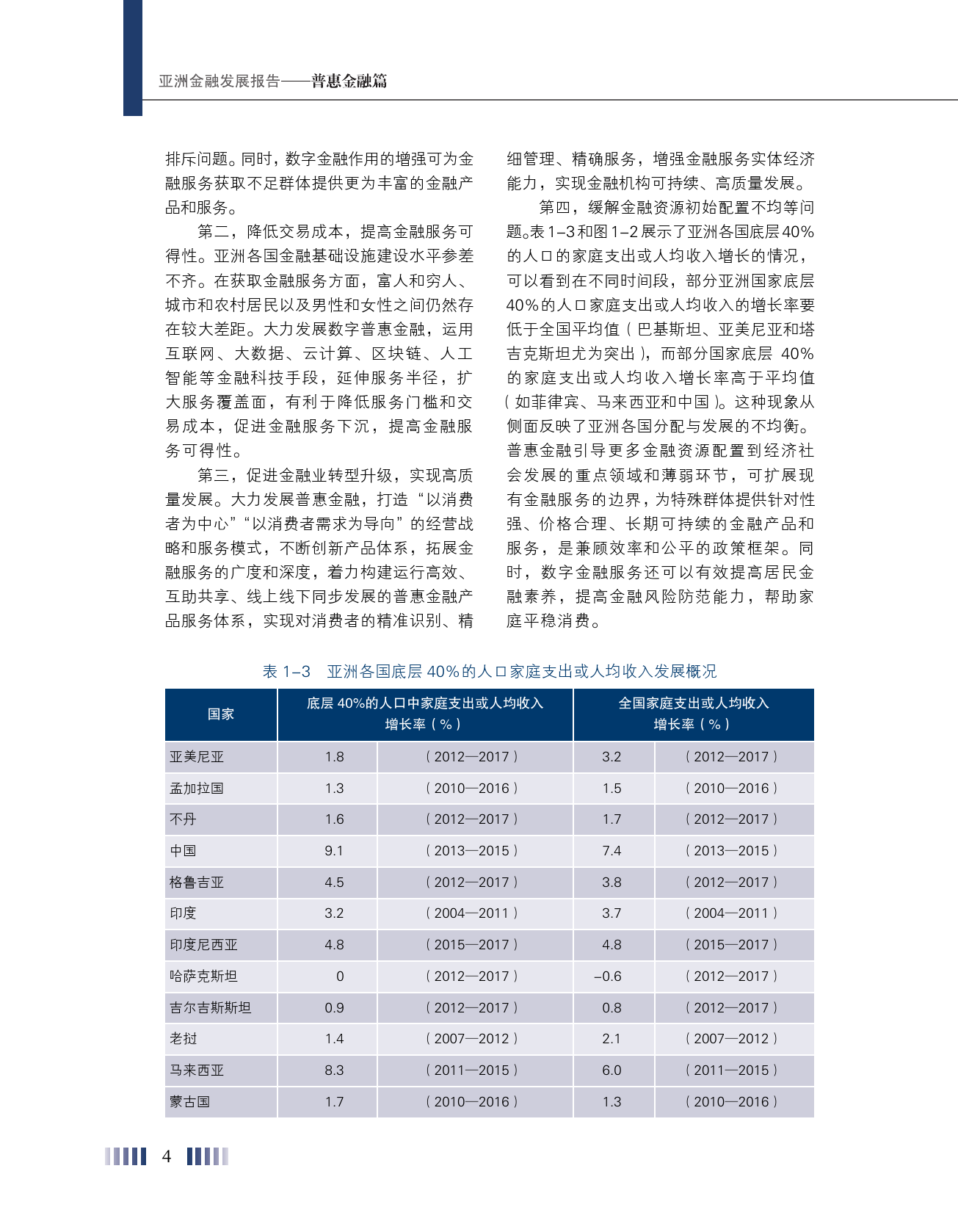 报告从普惠金融生态体系的视角梳理了亚洲各国普惠金融发展经验,如中国在国家战略、货币信贷、财税政策、治理框架和机构能力等方面为普惠金融发展作出的努力,柬埔寨在全国性征信体系建设方面取得的成就,蒙古国与韩国在金融消费者素养、普惠保险服务、消费者保护领域作出的努力和取得的显著效果等。