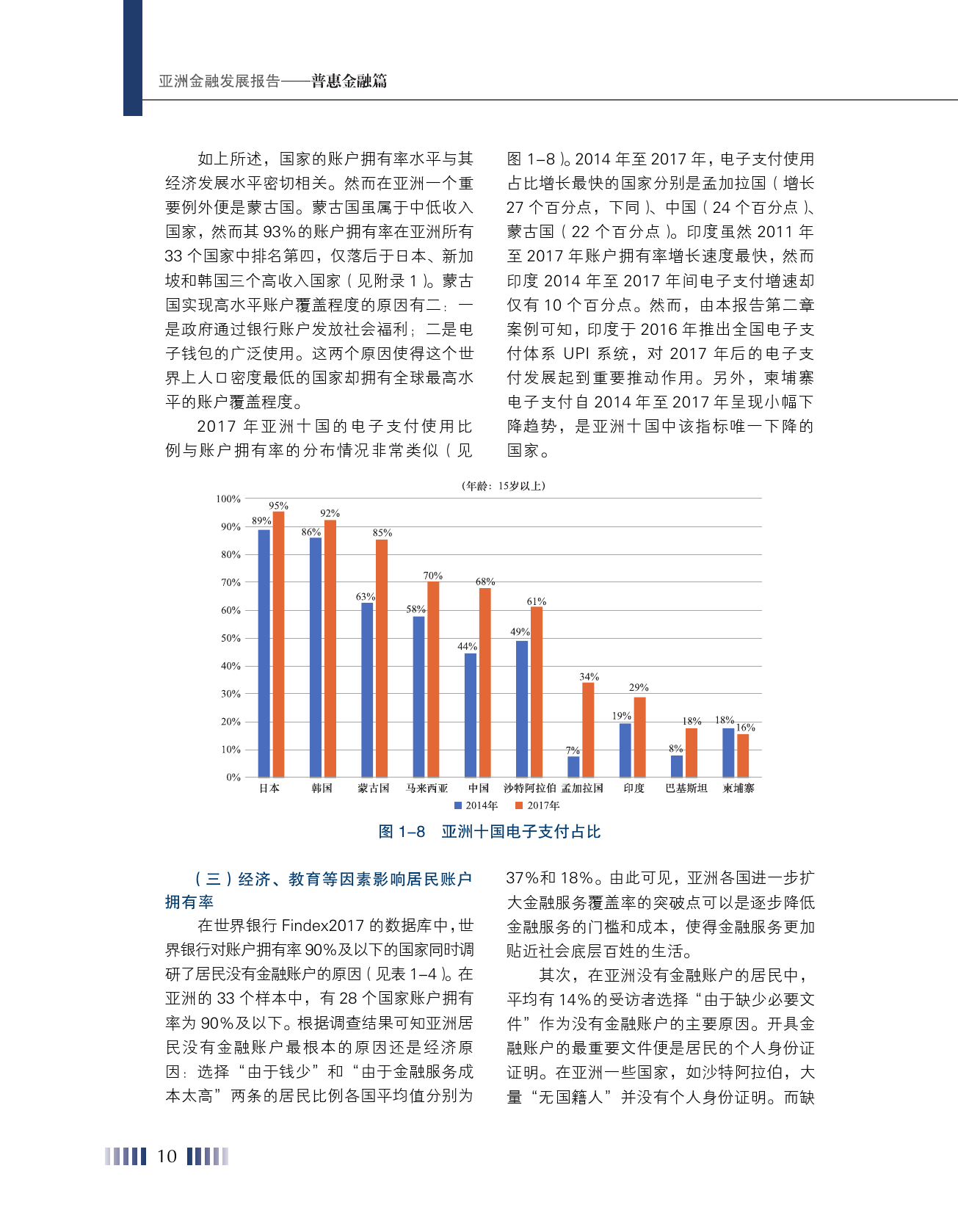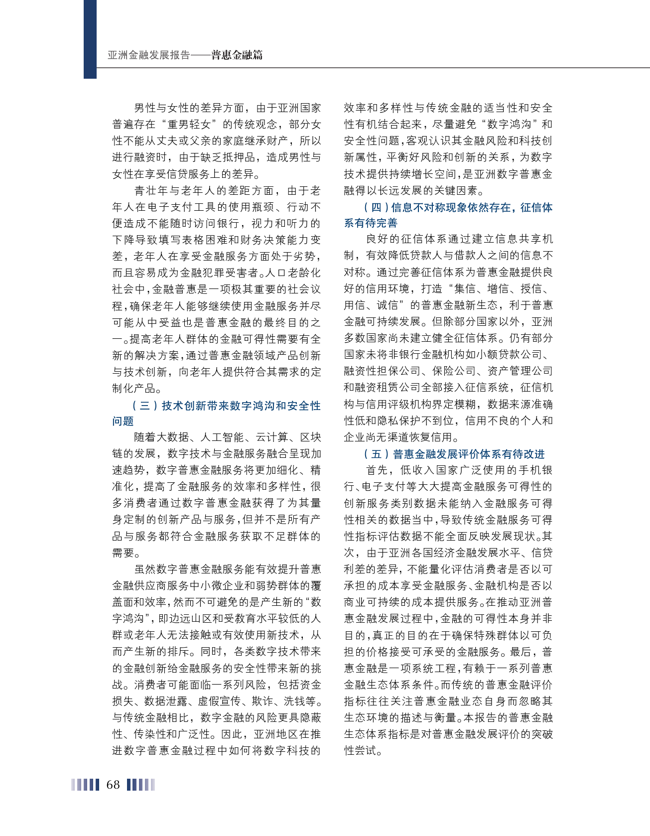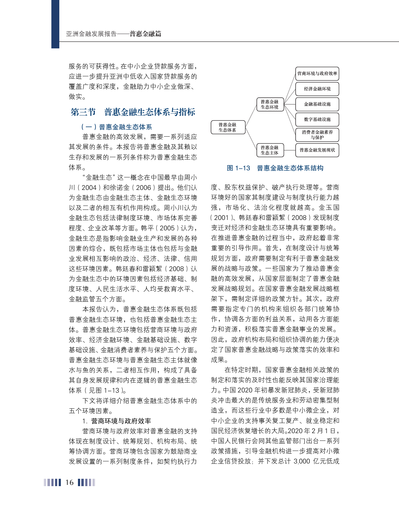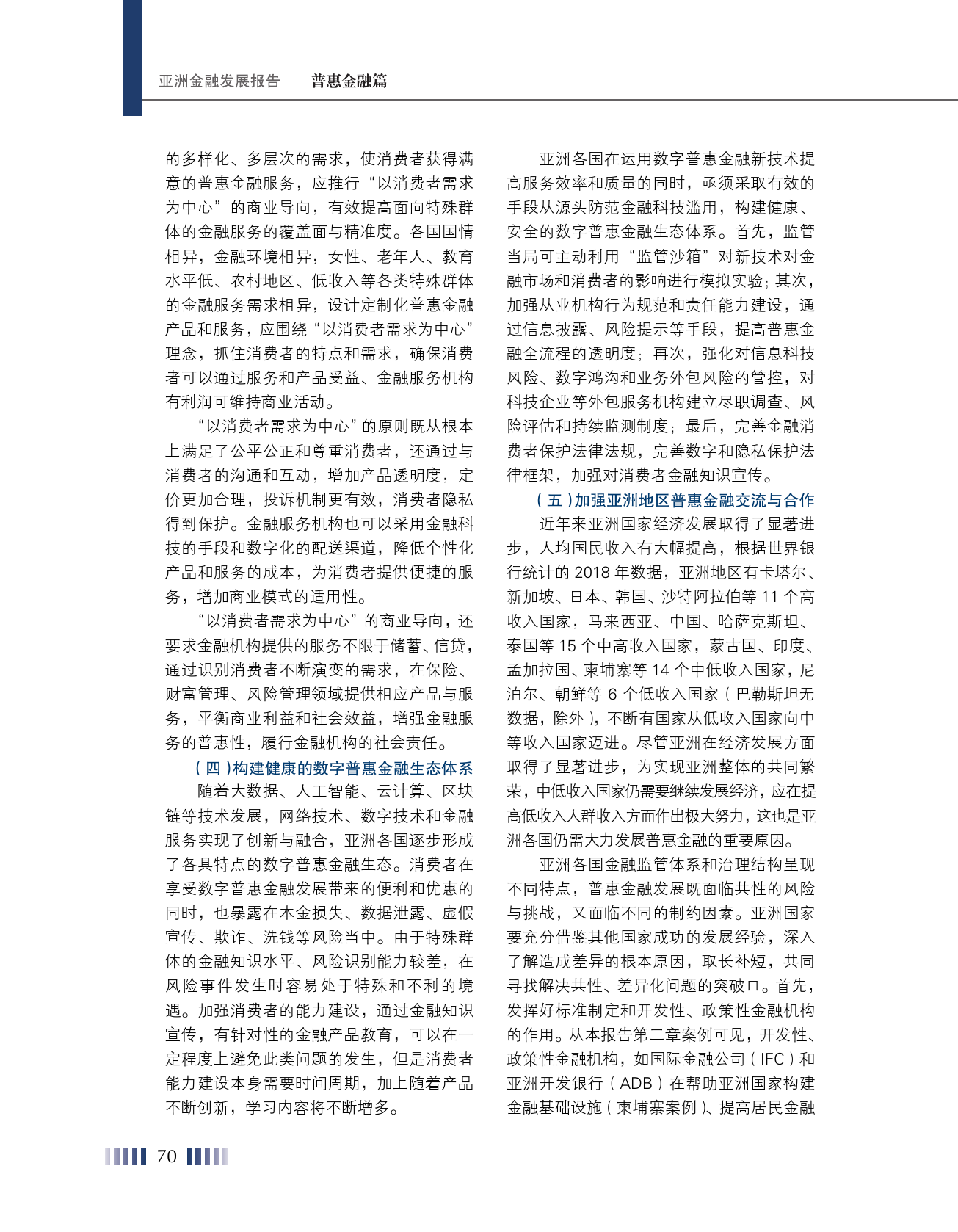 报告从普惠金融生态体系的视角梳理了亚洲各国普惠金融发展经验,如中国在国家战略、货币信贷、财税政策、治理框架和机构能力等方面为普惠金融发展作出的努力,柬埔寨在全国性征信体系建设方面取得的成就,蒙古国与韩国在金融消费者素养、普惠保险服务、消费者保护领域作出的努力和取得的显著效果等。