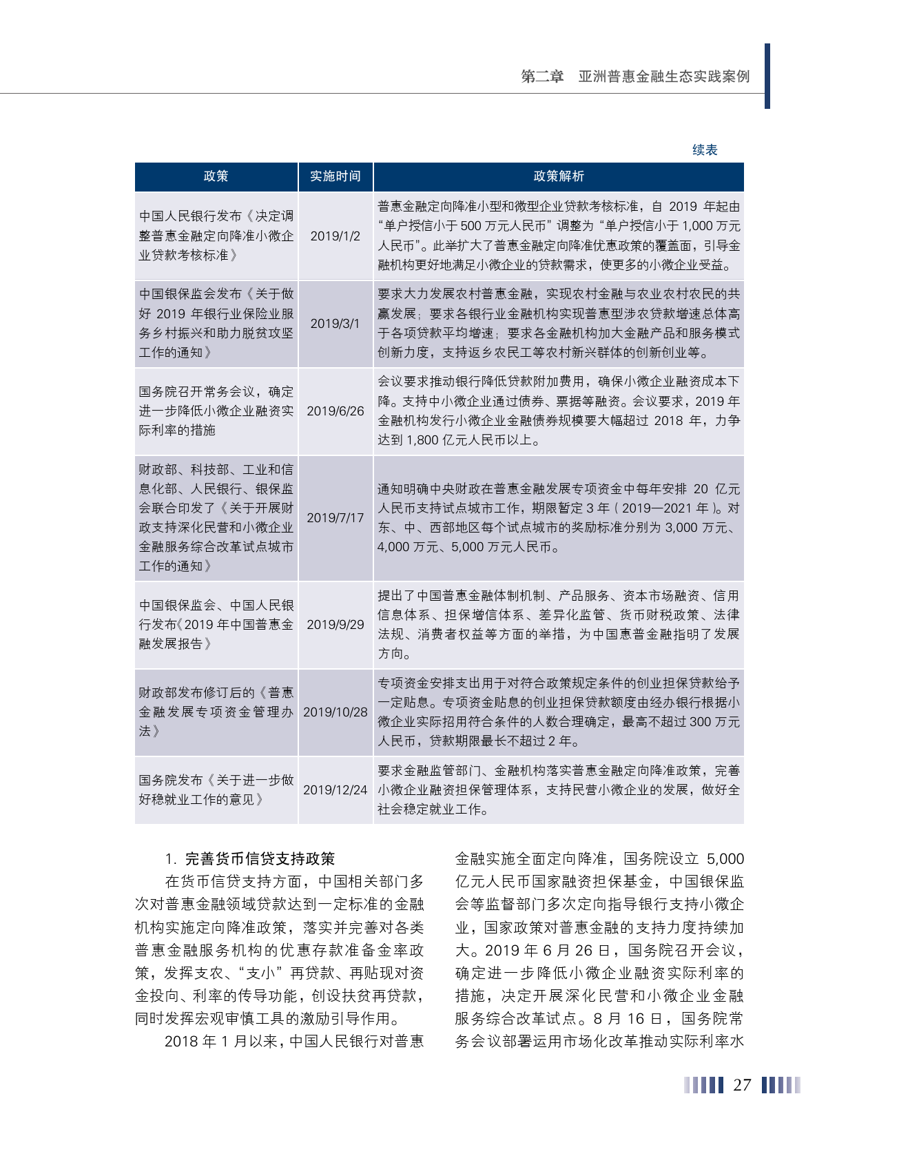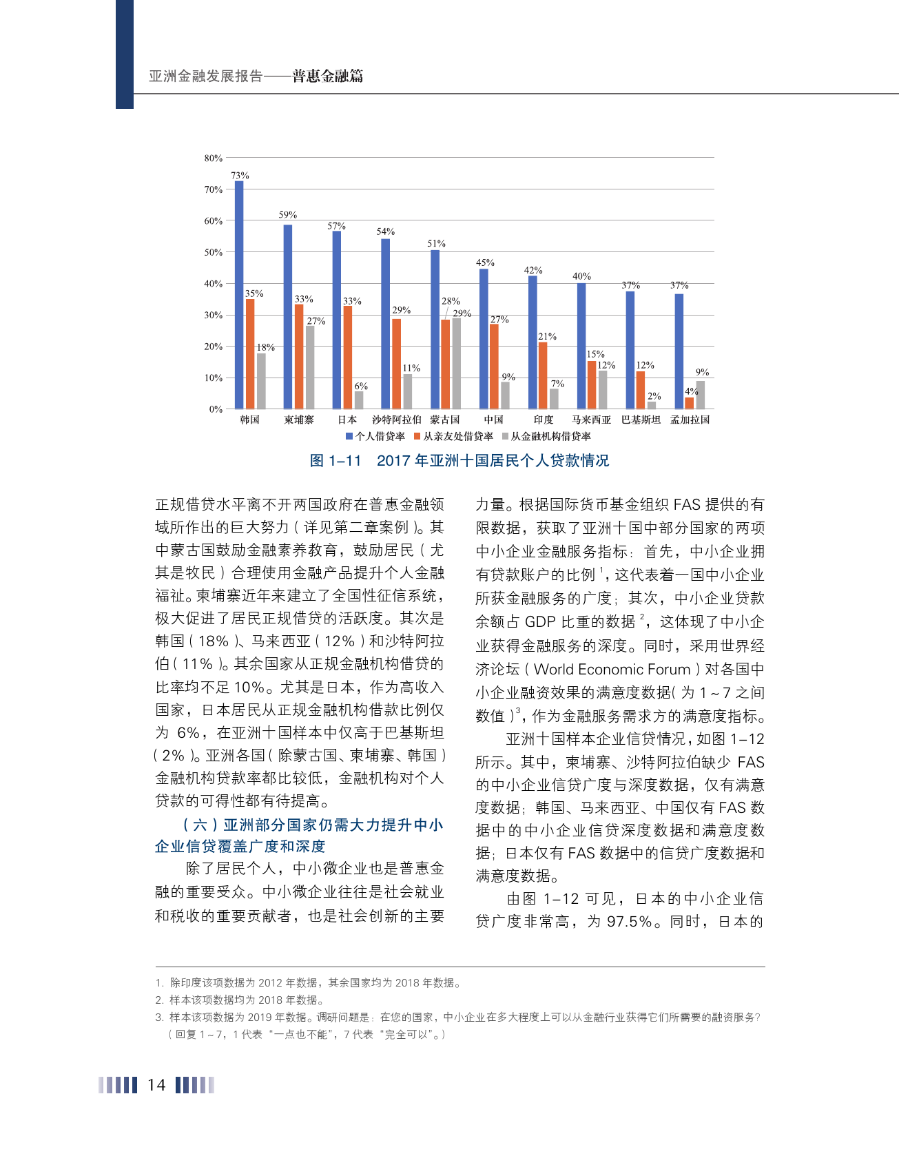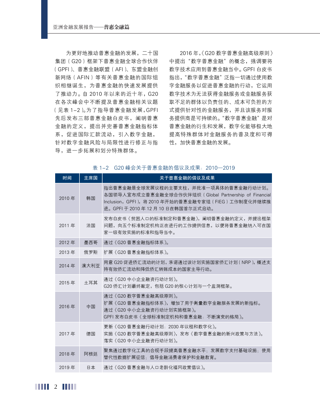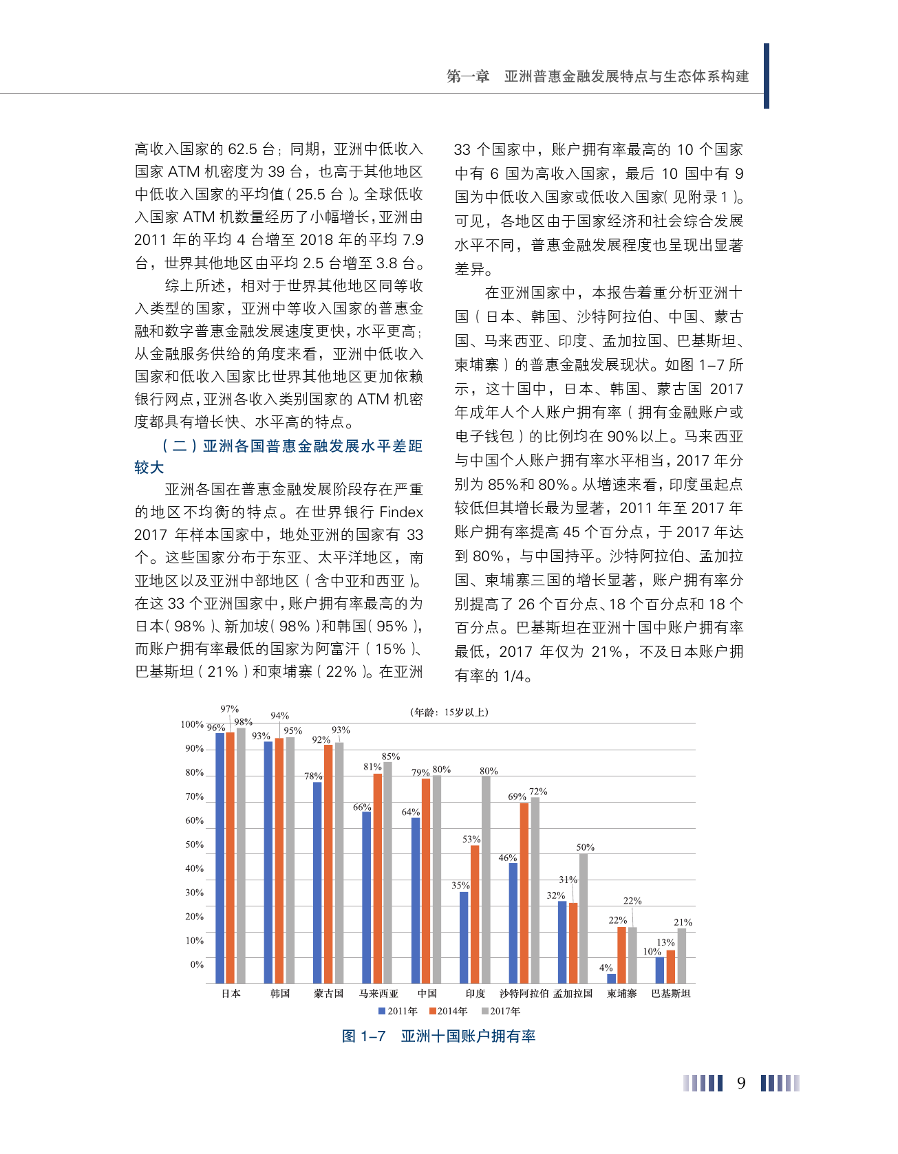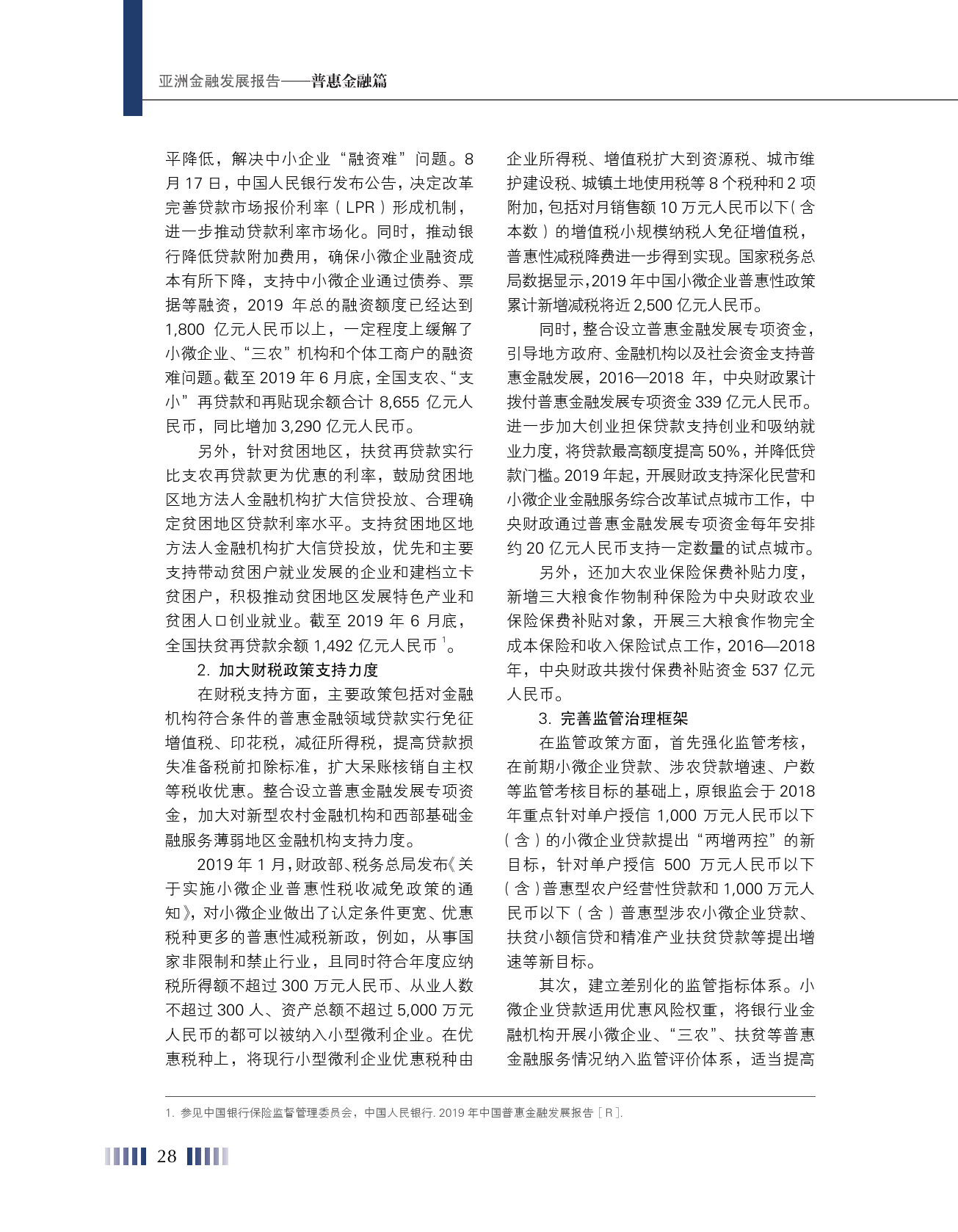报告从普惠金融生态体系的视角梳理了亚洲各国普惠金融发展经验,如中国在国家战略、货币信贷、财税政策、治理框架和机构能力等方面为普惠金融发展作出的努力,柬埔寨在全国性征信体系建设方面取得的成就,蒙古国与韩国在金融消费者素养、普惠保险服务、消费者保护领域作出的努力和取得的显著效果等。