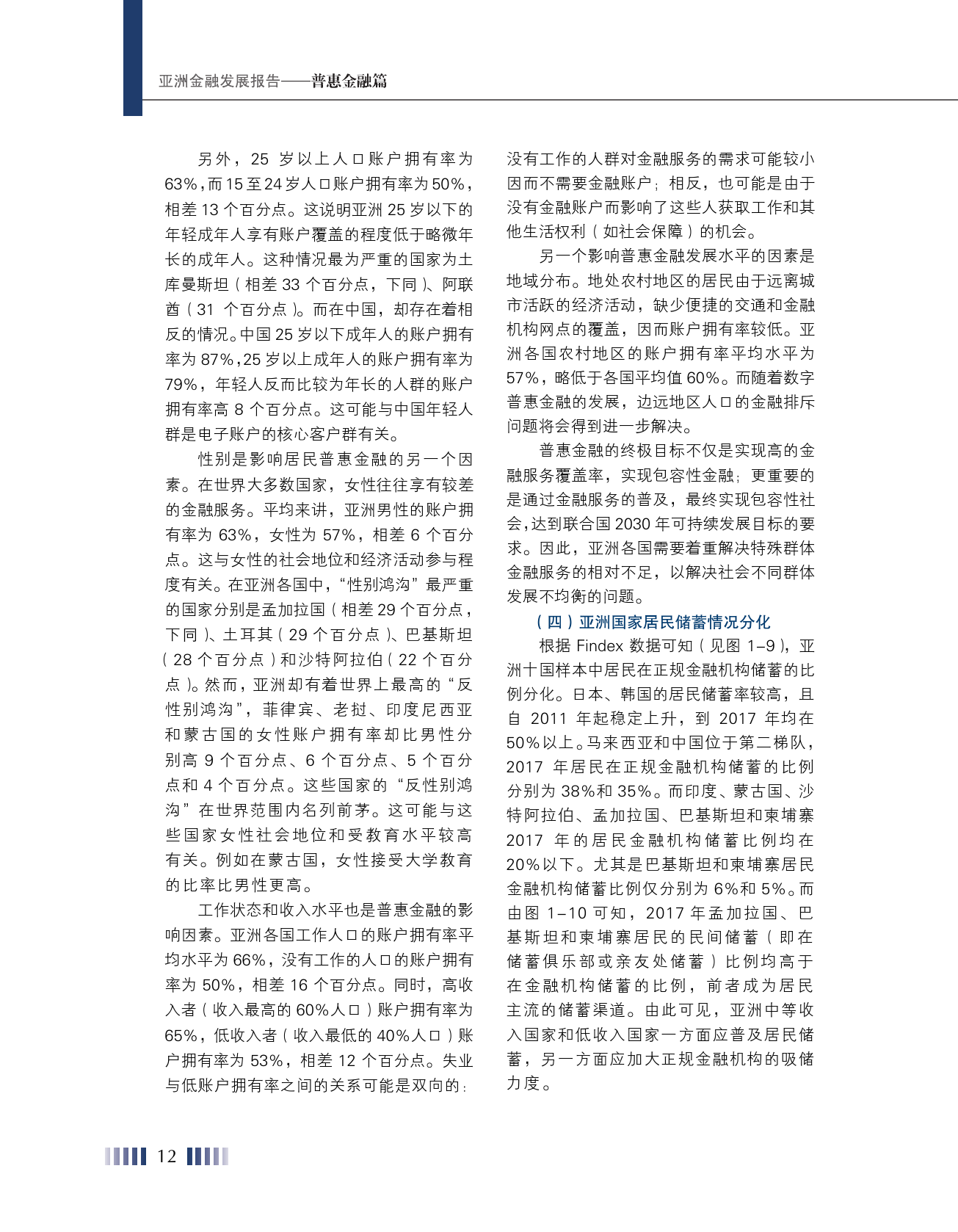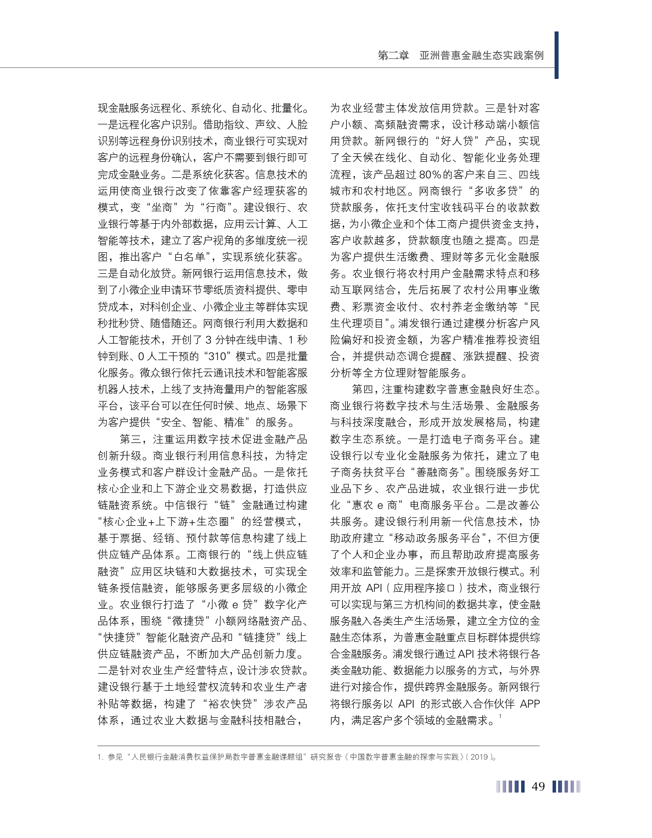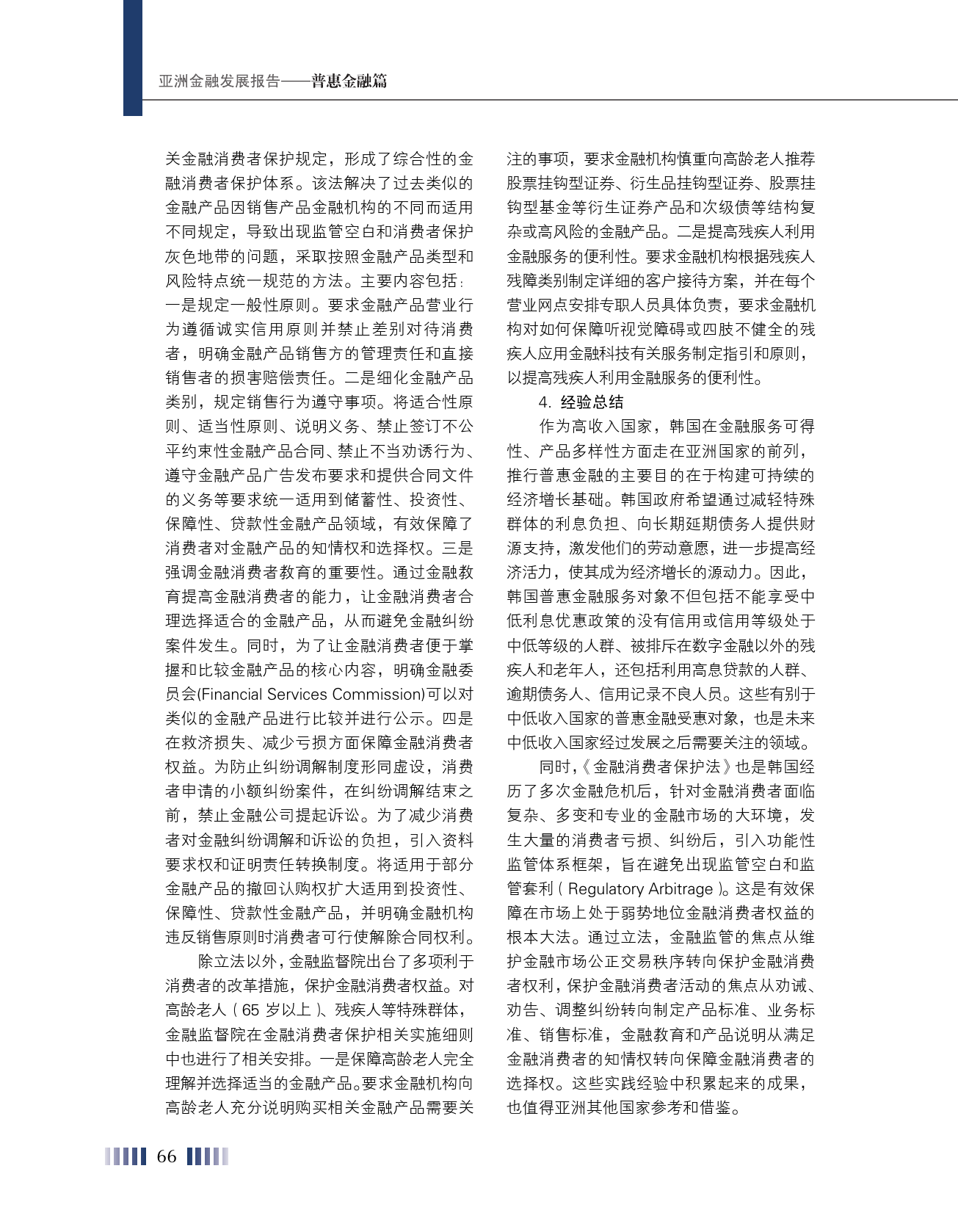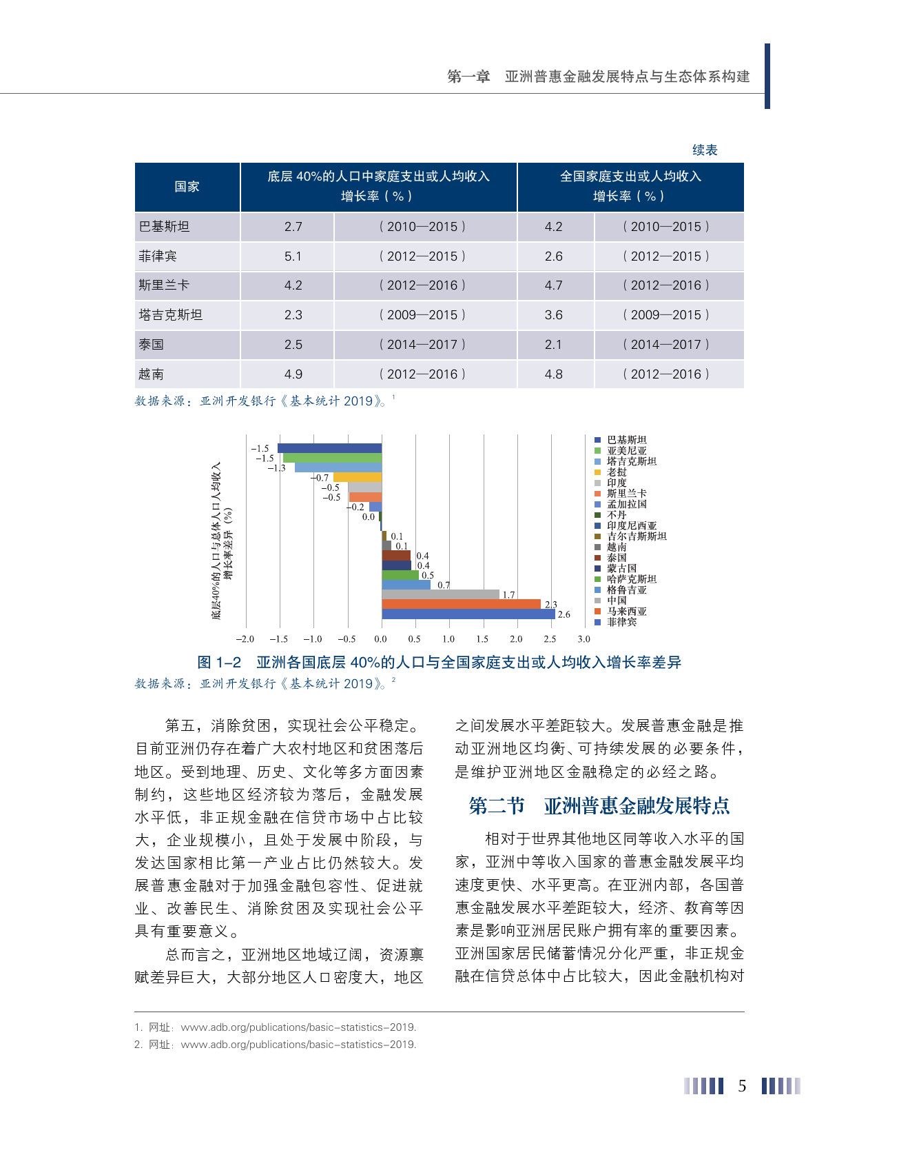 报告从普惠金融生态体系的视角梳理了亚洲各国普惠金融发展经验,如中国在国家战略、货币信贷、财税政策、治理框架和机构能力等方面为普惠金融发展作出的努力,柬埔寨在全国性征信体系建设方面取得的成就,蒙古国与韩国在金融消费者素养、普惠保险服务、消费者保护领域作出的努力和取得的显著效果等。