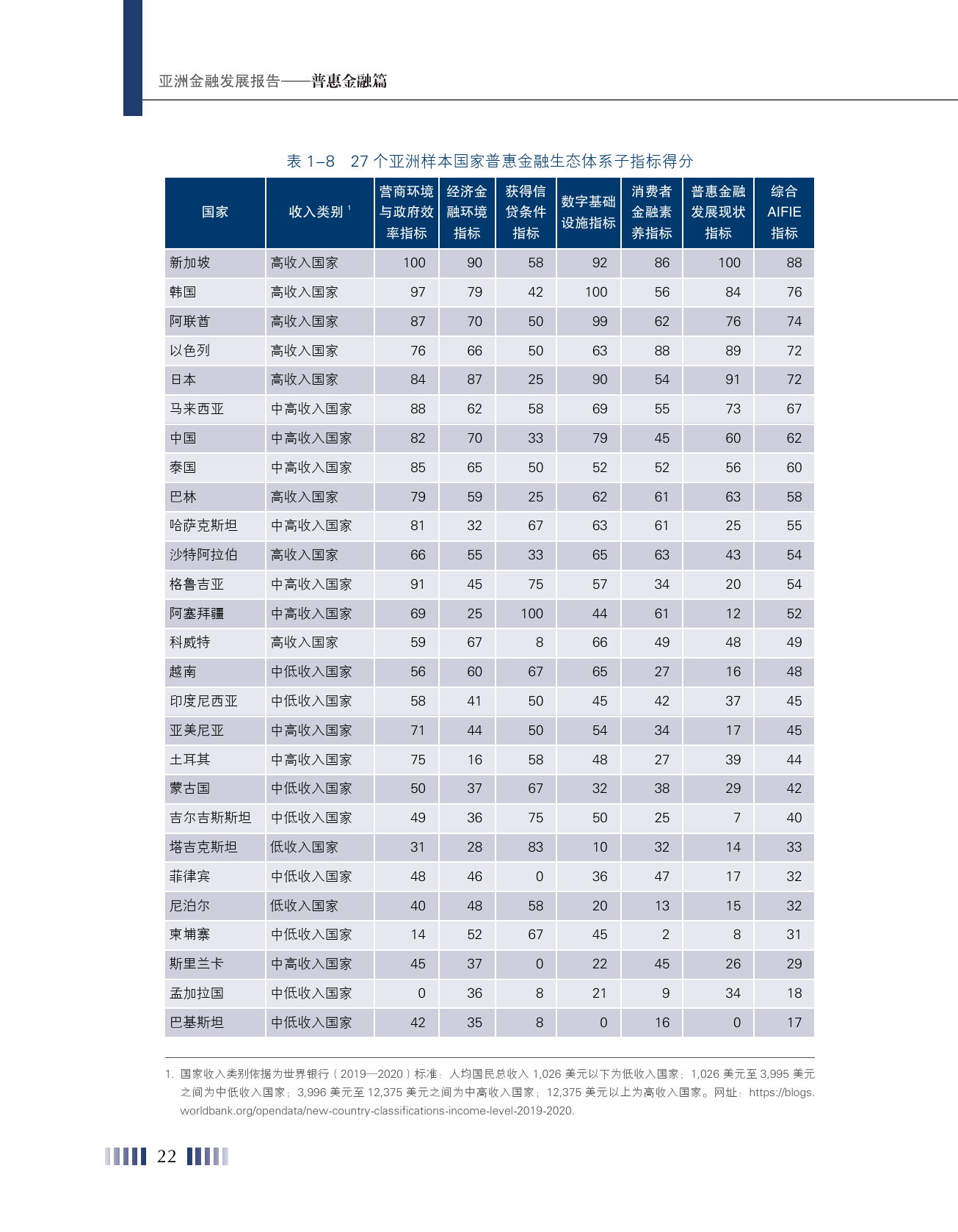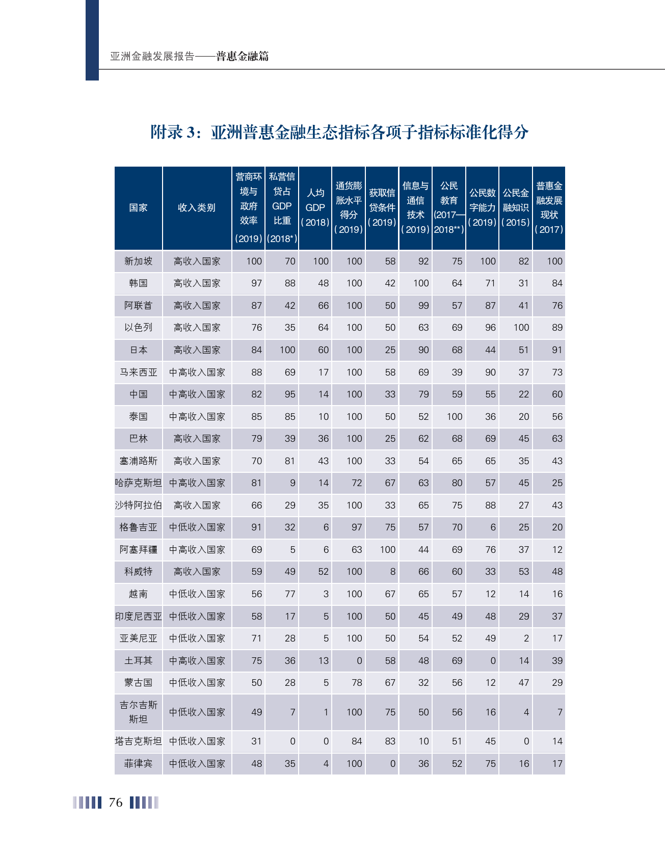 亚洲普惠金融生态建设与数字化发展圆桌会上发布的《亚洲金融发展报告——普惠金融篇》建立了较为全面的“亚洲普惠金融生态体系指标”,尝试对亚洲样本国家普惠金融生态体系的综合情况进行客观评估。