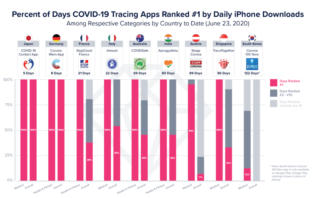 这些应用无一例外都是由政府支持,下图从左至右分别为日本的 COVID-19 Contact App、德国的 Corona-Warn-App、法国的 StopCovid France、意大利的 Immuni 应用、澳大利亚的 COVIDSafe、奥地利的 Stopp Corona、印度的 Aarogya Setu、新加坡的 TraceTogether 以及韩国的 Corona 100 News。下图汇总了截至 6 月 23 日,这些应用在 iOS 应用商店已上线的天数及排名情况。可以看到,大部分应用都在 iPhone 的医疗或健康健美下载榜连续排名第一,日本和德国的应用甚至在总榜也高居第一。