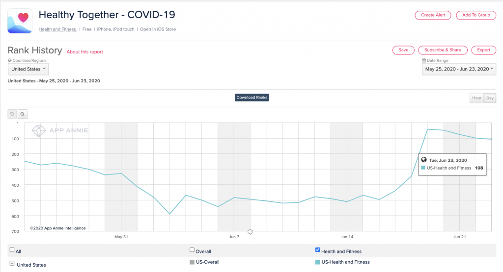 尽管犹他州人口总数不到美国总人口的 1% ,且该应用仅供犹他州用户使用,但截至 2020 年 6 月 23 日,Healthy Together 已成为美国 iPhone 下载量排名前 110 位的健康健美应用。甚至在使用高峰期,该应用在健康健美类别下排到第 50 位,在医疗应用类别下排到第 56 位(该应用曾更改所归属的应用商店类别)。