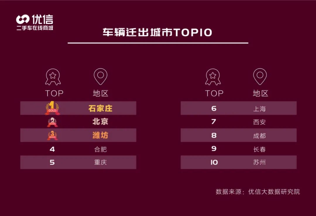 《报告》显示,二手车跨区域流通比例在过去几年不断提升,跨区域交易主要集中在华中、华东和华北地区。2020上半年,石家庄成为二手车迁出量最大城市,西安则为迁入量最大城市,成都、重庆分别排名迁入量城市二三位。迁入与迁出城市均进入前十的包括北京、重庆、成都、西安、上海、合肥。
