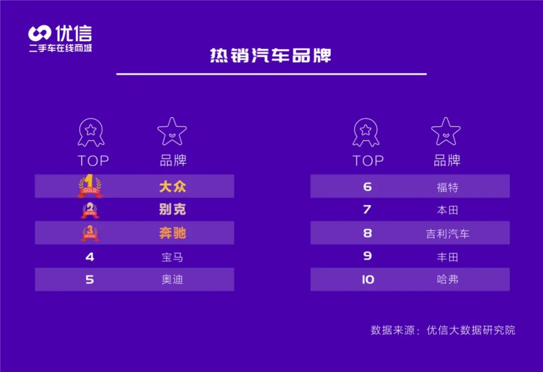 《报告》显示,大众长期“霸占”热销汽车品牌榜首,毫无疑问,大众品牌的实用性、性价比等综合测评都在消费者心中有较高的位置。别克、奔驰、宝马、奥迪紧随其后,刷榜前五名。