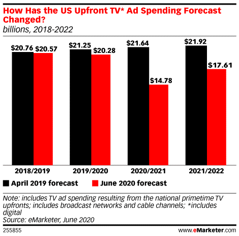 随着经济正式陷入衰退,生产延迟给秋季广告库存带来了不确定性,广告主可能也会对2020-2021年度的支出进行重大调整。2020年4月BMO Capital Markets的一项研究发现,预付库存销售额预计将占美国电视网络总库存的40%-60%,而通常为70%-80%。