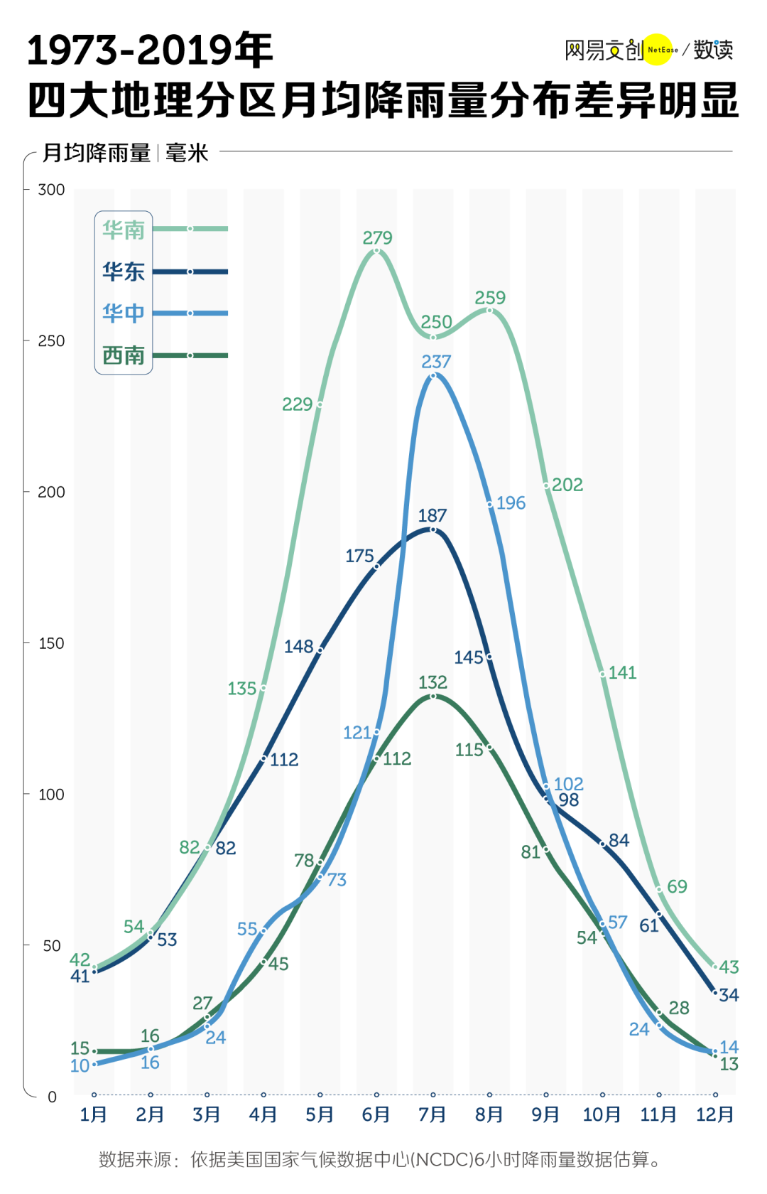 从这个角度出发,在全国雨水最多的这四个地区,华南地区的月度降雨量差距比较大,其次是华中地区,分配不均的雨量让它们更有可能发生洪涝灾害。