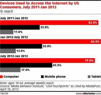 Media Behavior Institute针对美国人的调查显示,移动设备的发展使得桌面互联网使用率下降,手机和平板电脑导致互联网用户使用计算机的时间减少。调查涉及的时间 为于2012年7月结束的6个月,以及于2013年1月结束的6个月。调查显示,在特定的一周内,桌面互联网使用率下降了5个百分点。