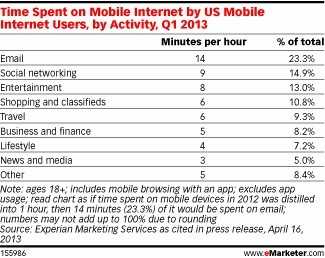 就互联网用户的上网活动而言,市场研究机构Experian Marketing Services发布的最新研究结果显示,美国移动互联网用户将最多的时间花在收发邮件上,比重达到23%,而当他们使用桌面互联网时,仅有5%的时间在收发邮件。