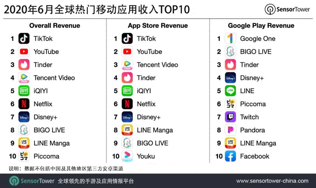 榜单前五名另外三款应用为Tinder,腾讯视频和爱奇艺。